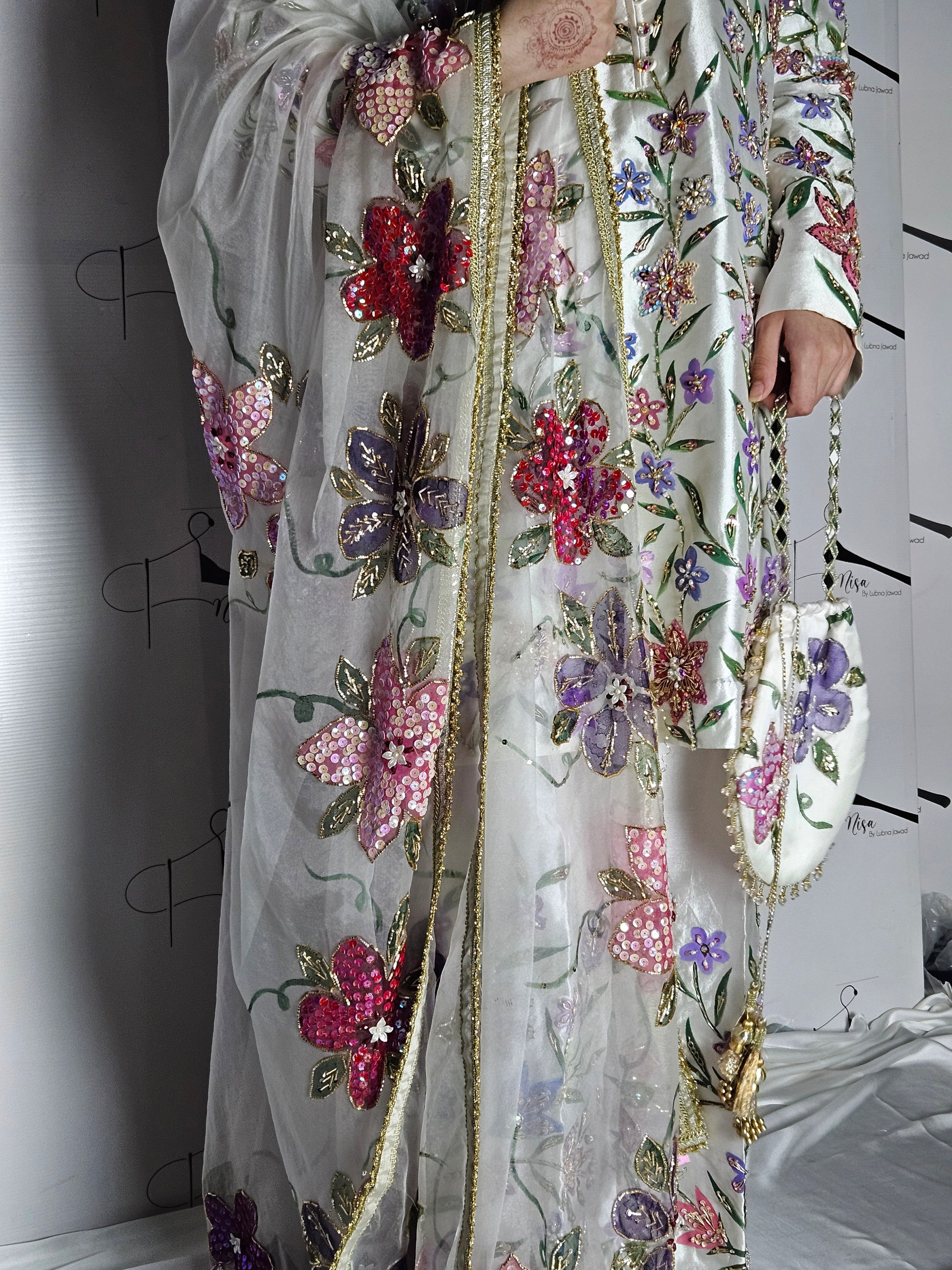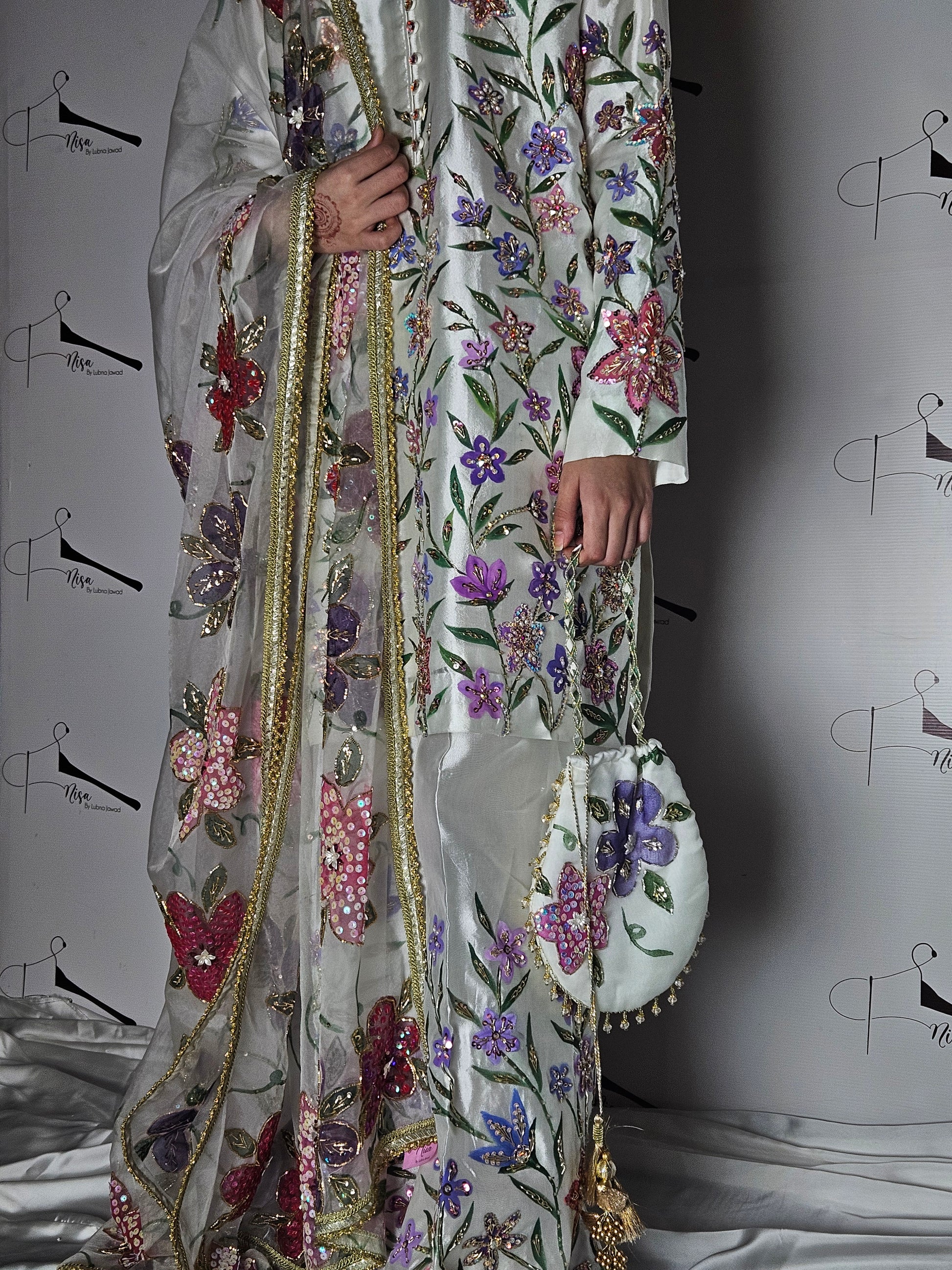 Dupatta: A matching Organza dupatta, light yet striking, hand-painted to drape you in effortless grace.
