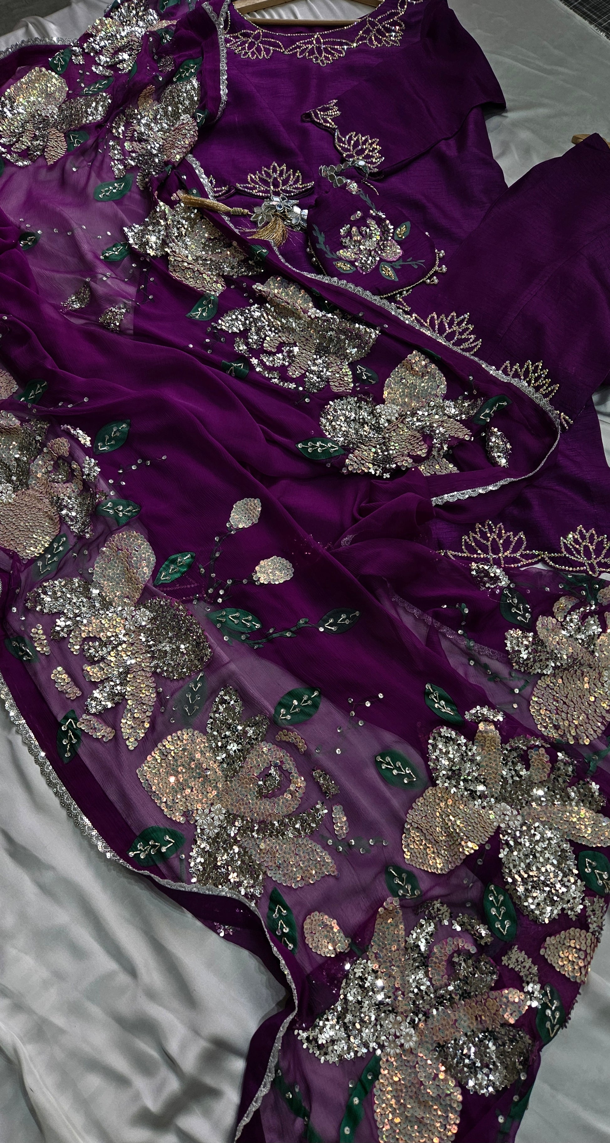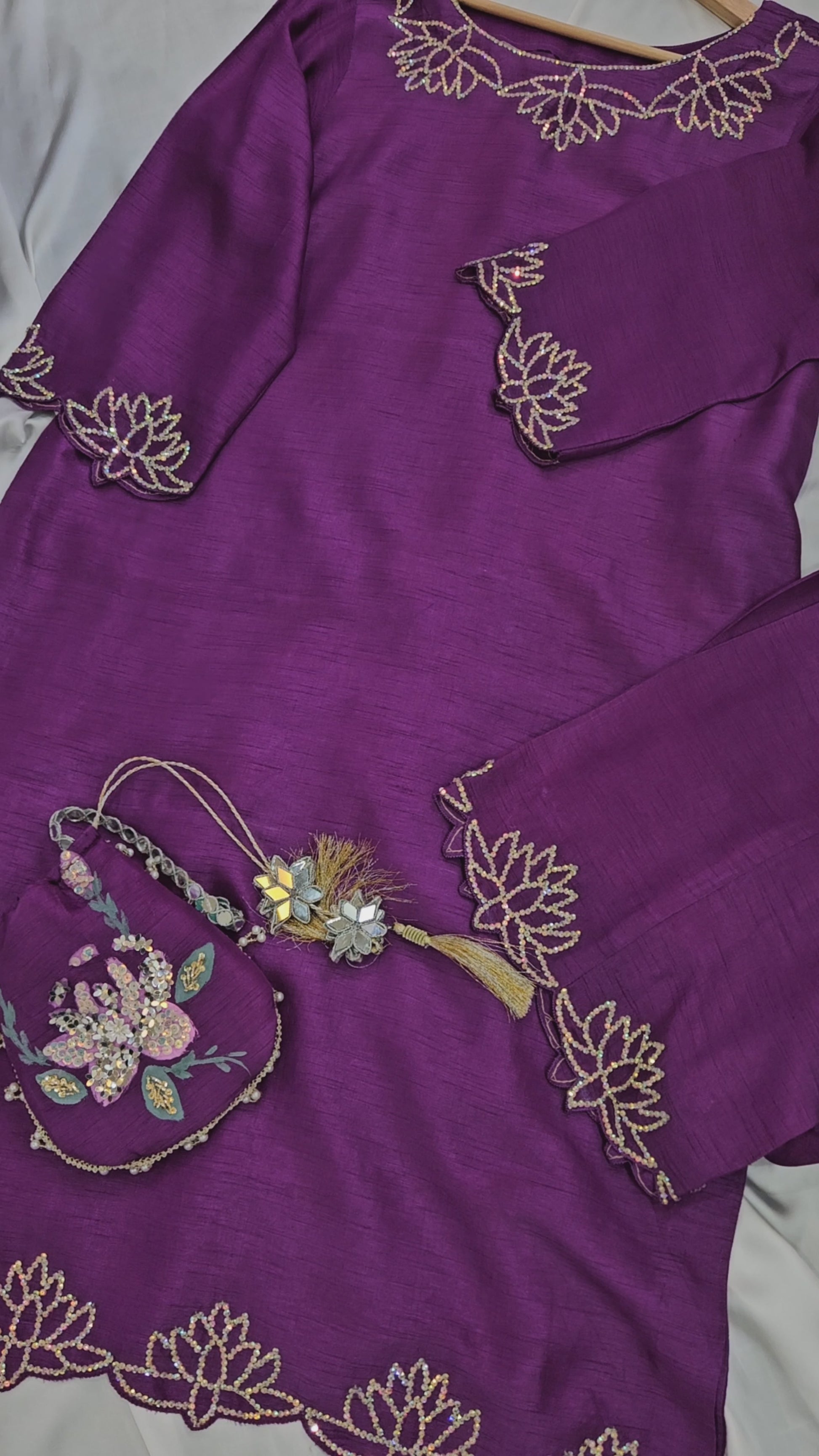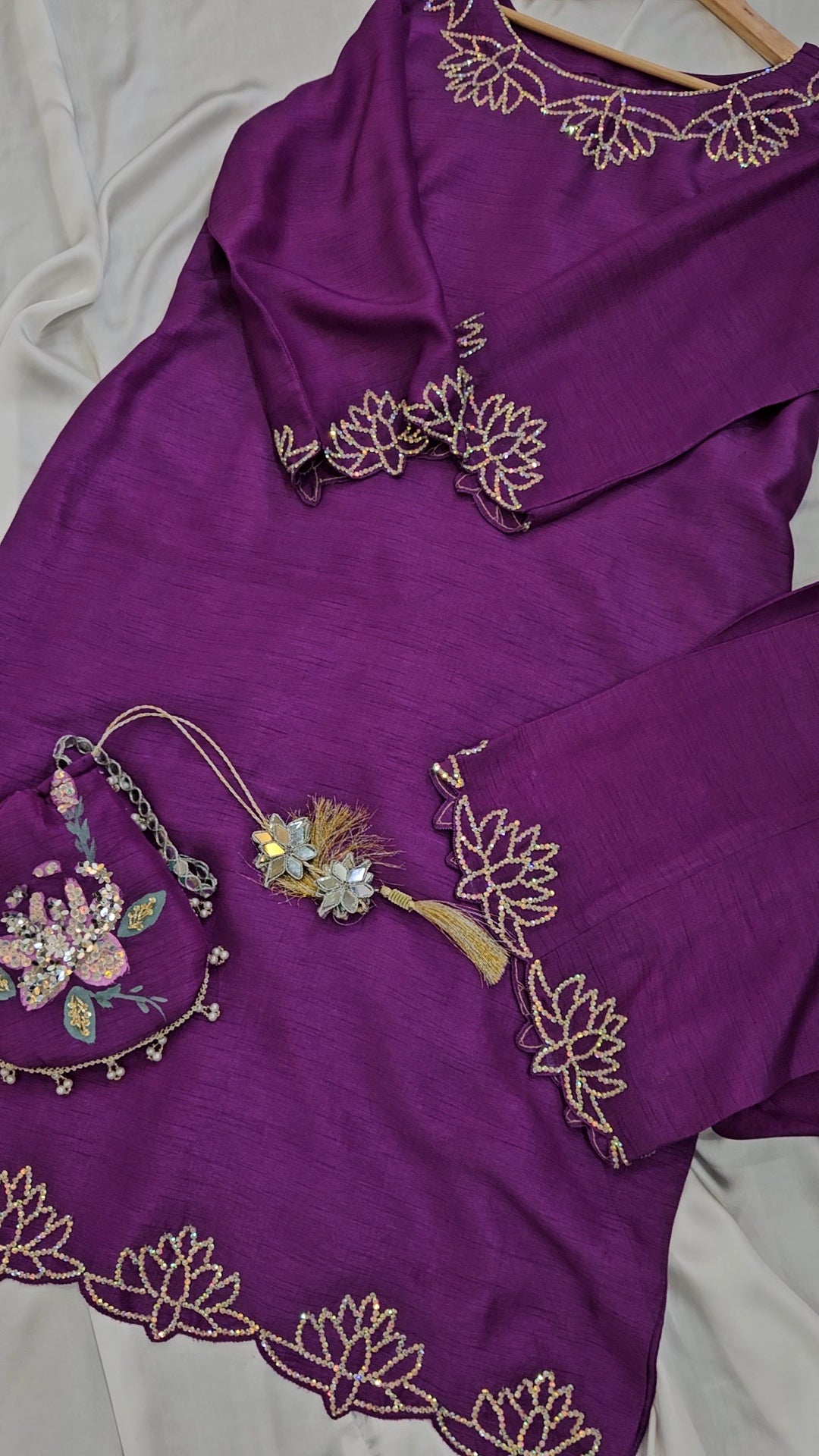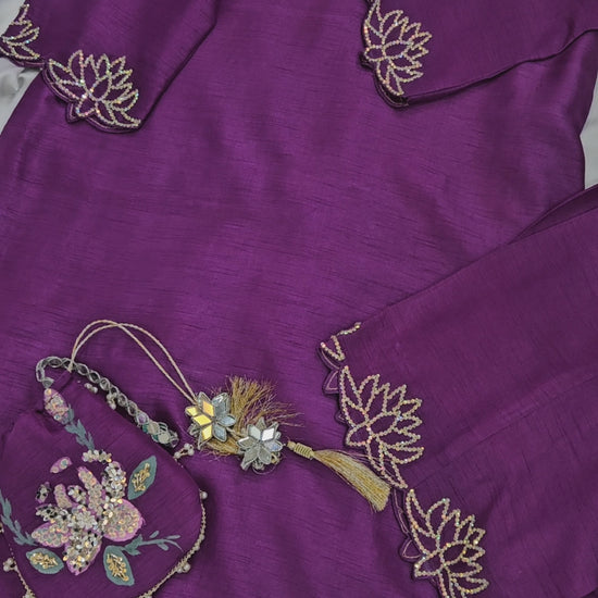This purple violet Korean raw silk shirt and trousers, adorned with Swarovski work, are paired with a hand-painted, embellished pure chiffon dupatta and a matching hand-painted pottli, creating a perfect blend of elegance and artistry.