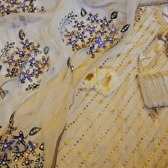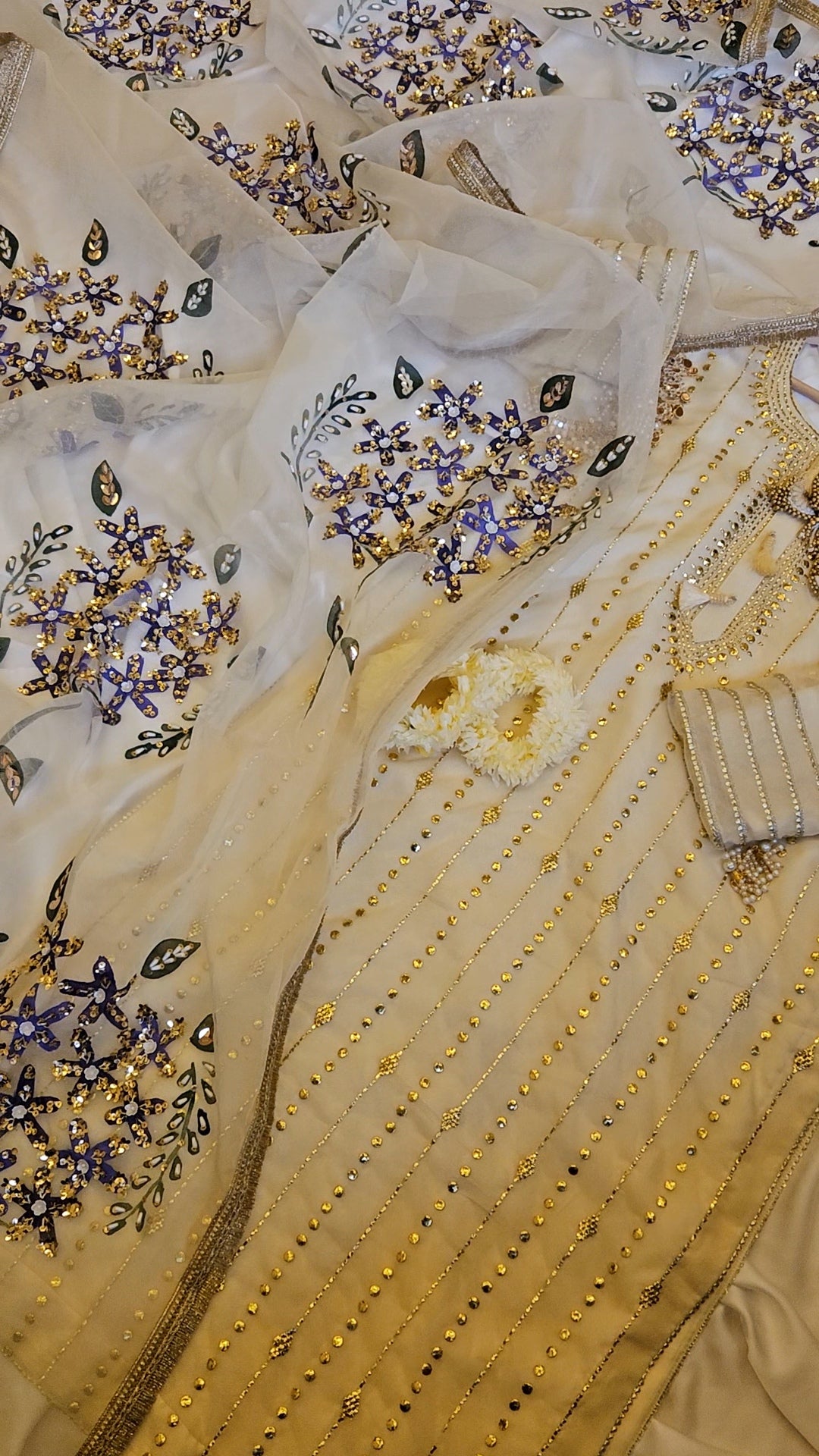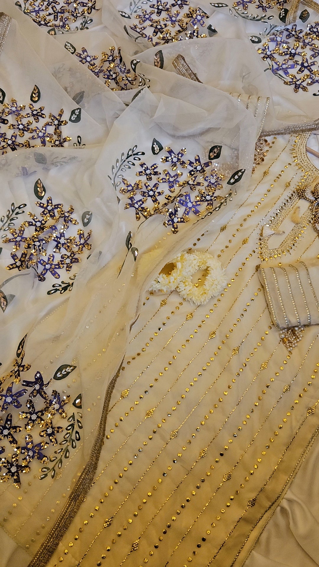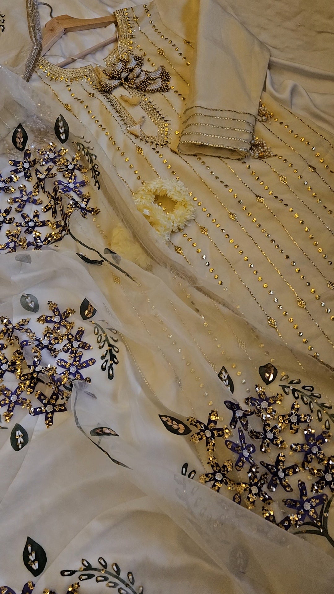 This elegant Organza Mukesh shirt features intricate detailing, paired with a plain sleek Korean raw silk trousers. The ensemble is complemented by a hand-painted and hand-embellished organza dupatta, adding a layer of delicate artistry and sophistication to the outfit. Perfect for a graceful and timeless style.