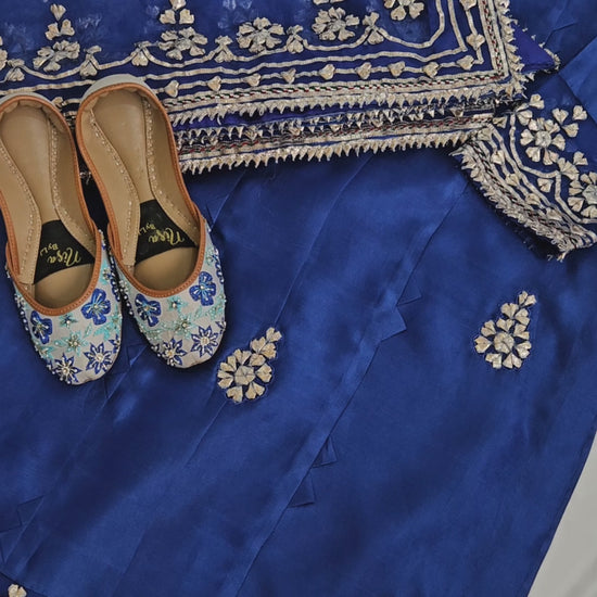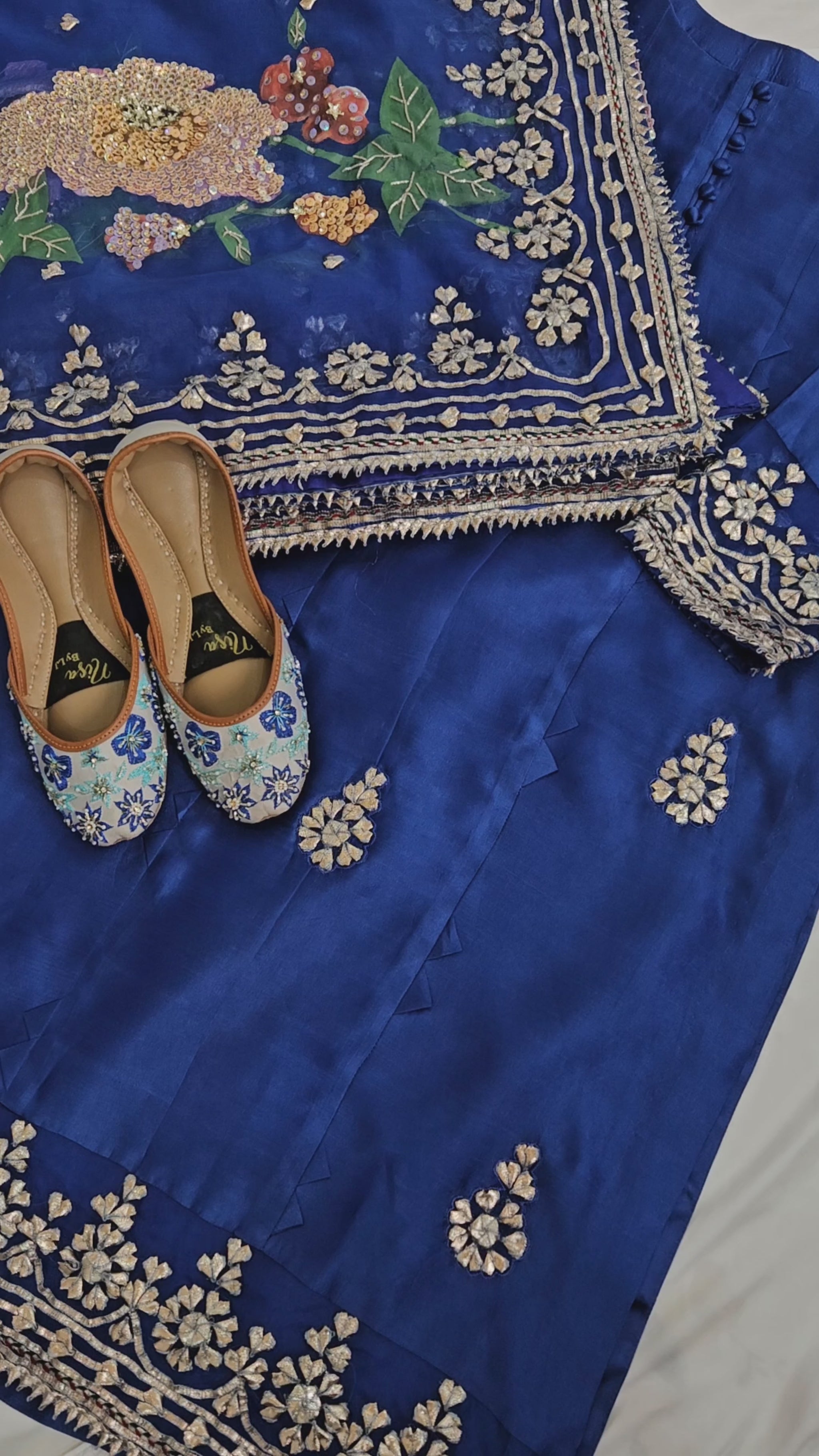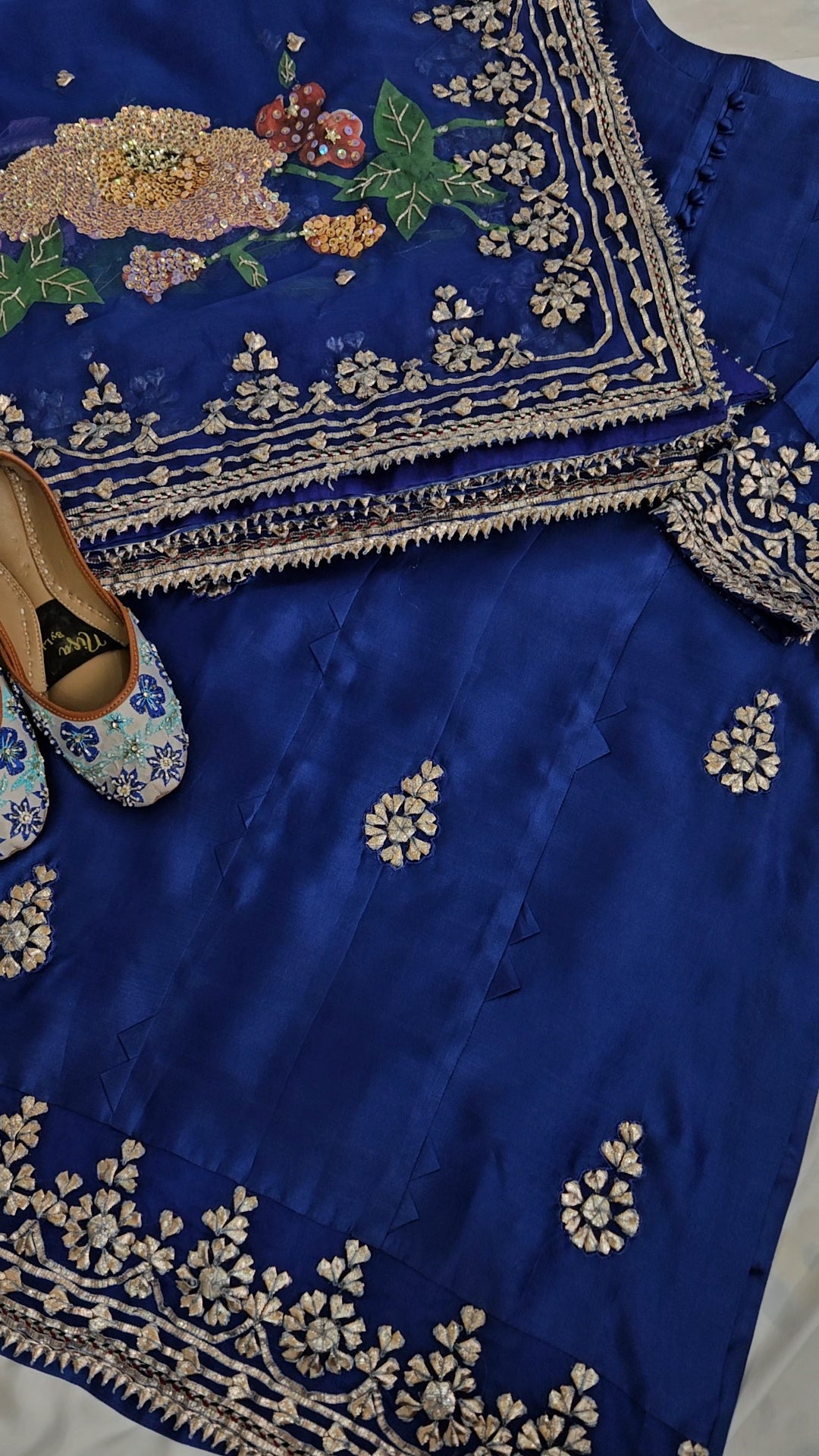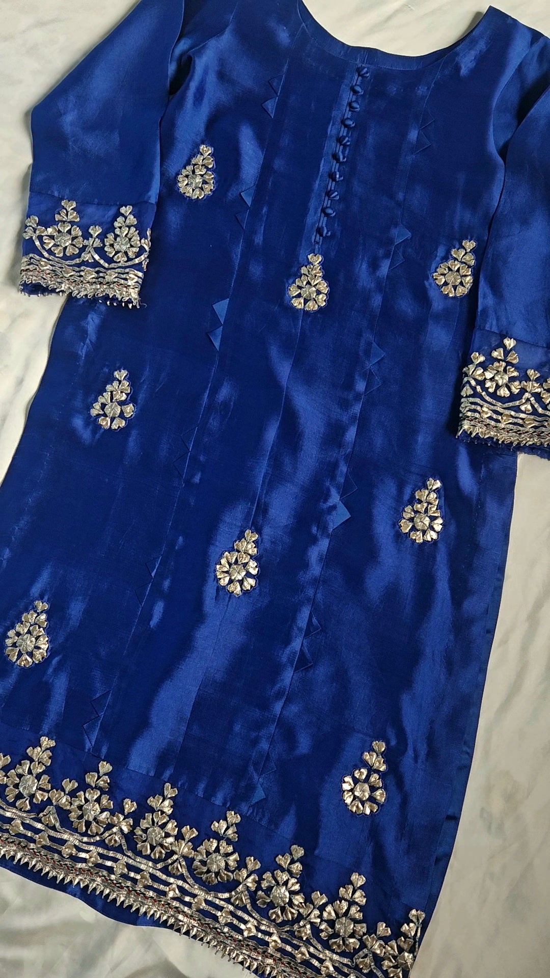 This elegant ensemble features a Korean raw silk shirt and trouser, adorned with delicate gota work for a touch of festive charm. Paired with a sheer organza dupatta, also detailed with gota, it strikes the perfect balance between tradition and sophistication. Ideal for celebratory events and formal occasions.