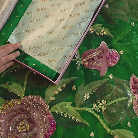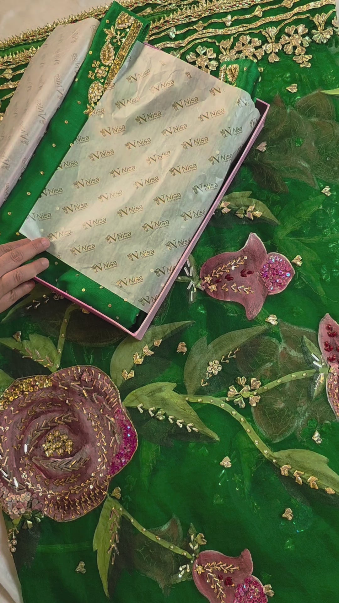 Indulge in timeless elegance with this exquisite green sheesha silk suit, adorned with intricate zarodsi and kora handwork. Paired with a matching sharara, this outfit blends traditional craftsmanship with luxurious fabric for a regal statement.