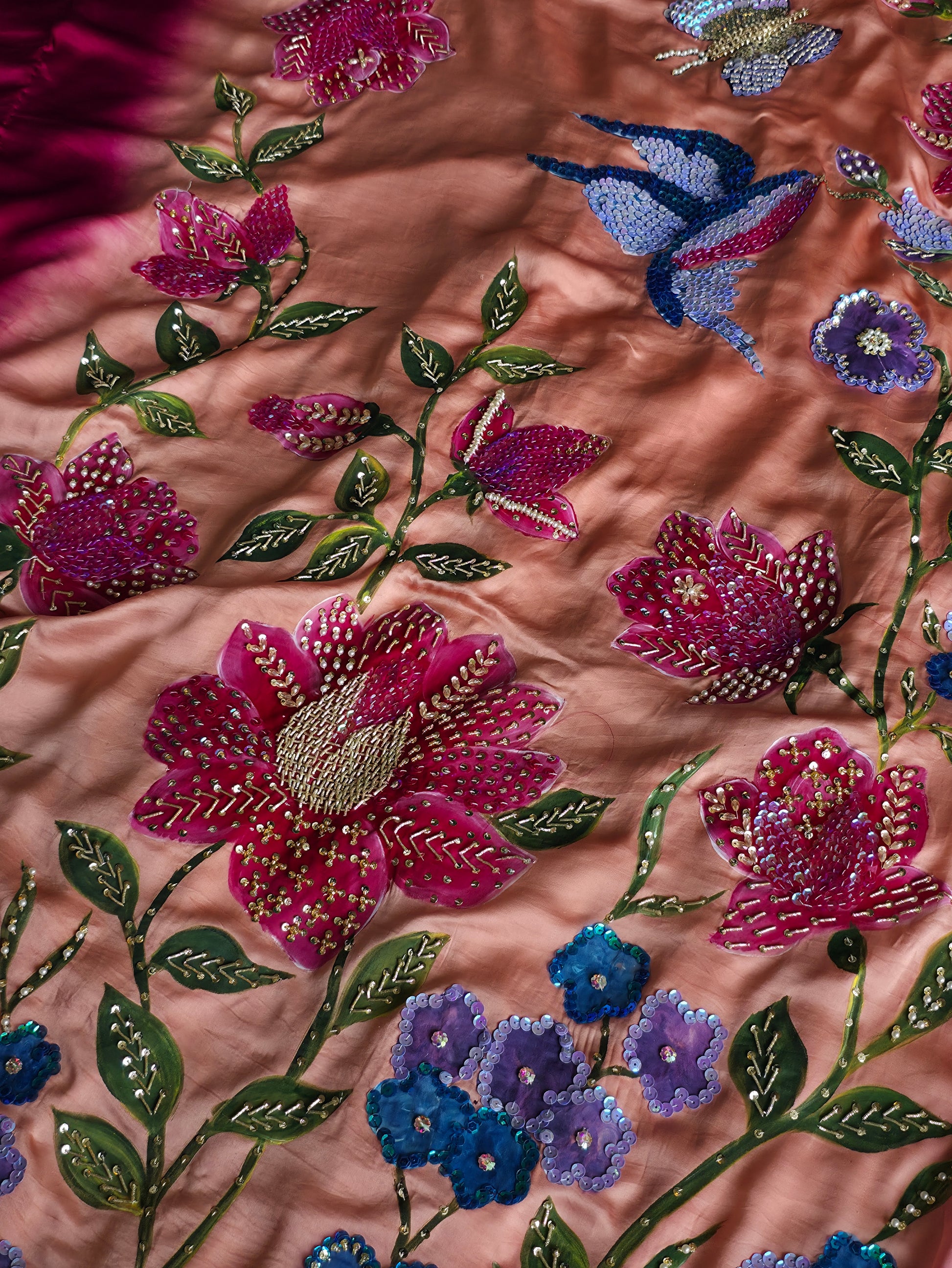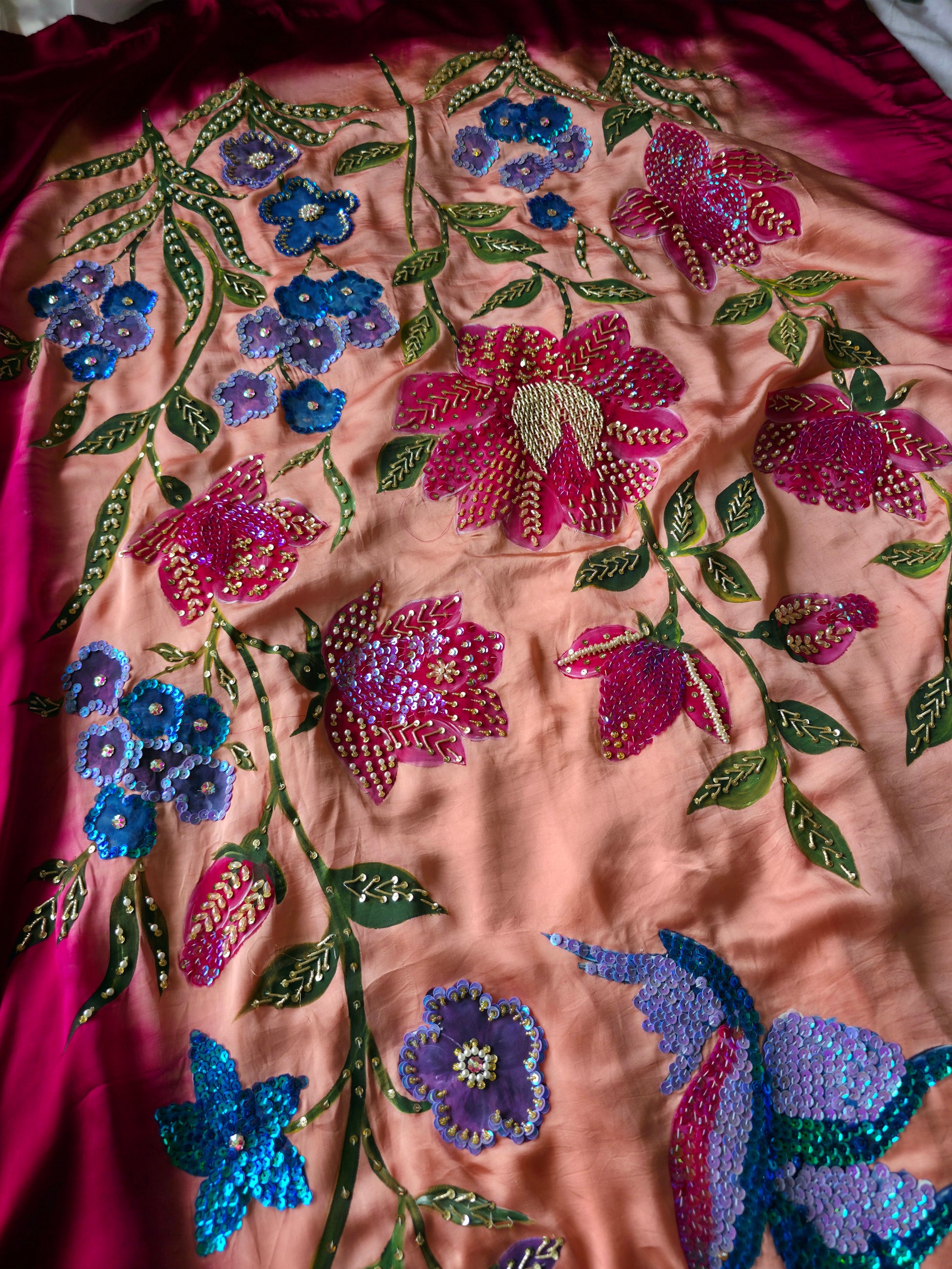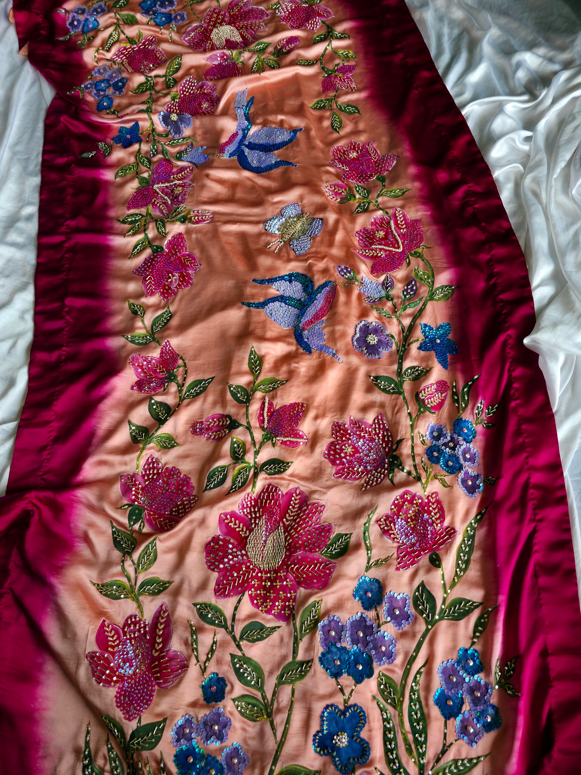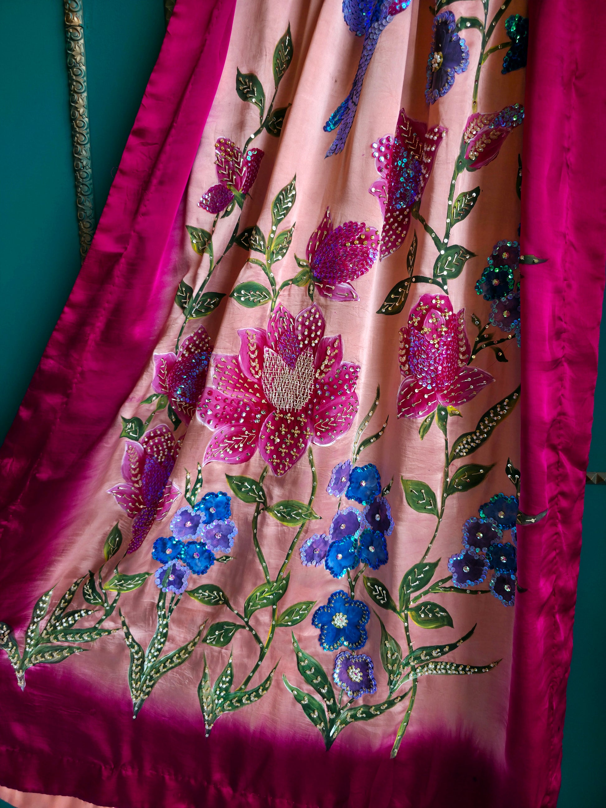 Crafted on pure Shamooz Silk, this luxurious shawl features intricate hand-painting and heavy embellishment — a true piece of wearable art.