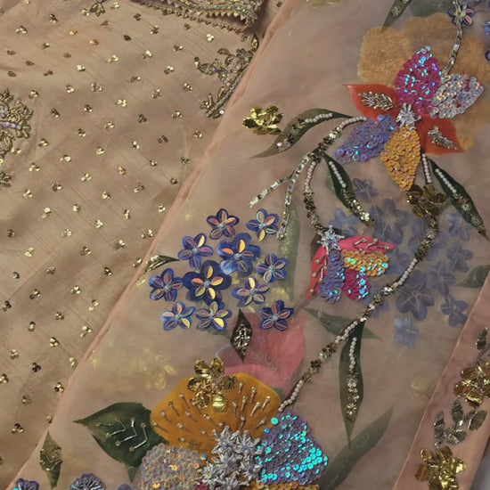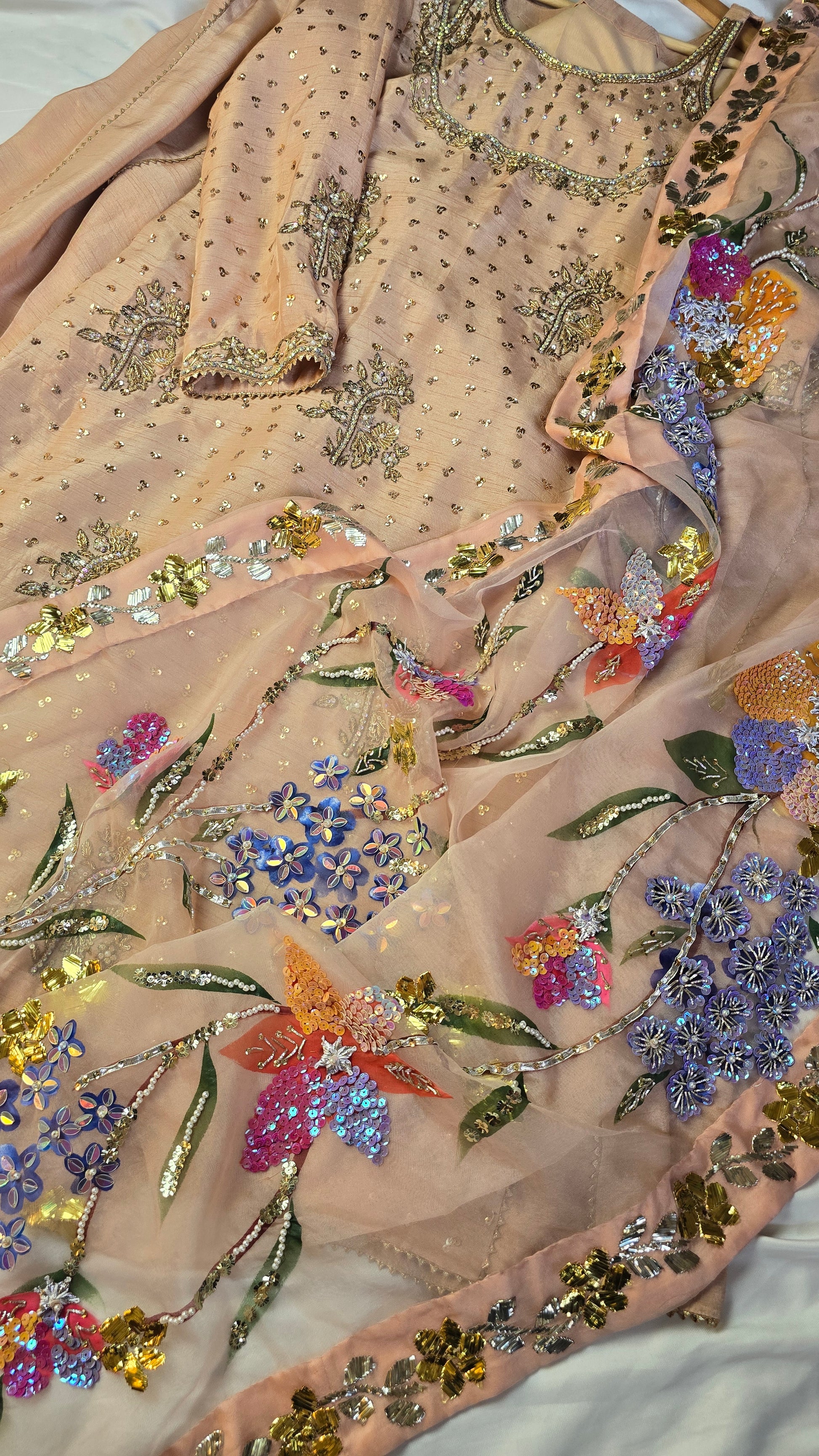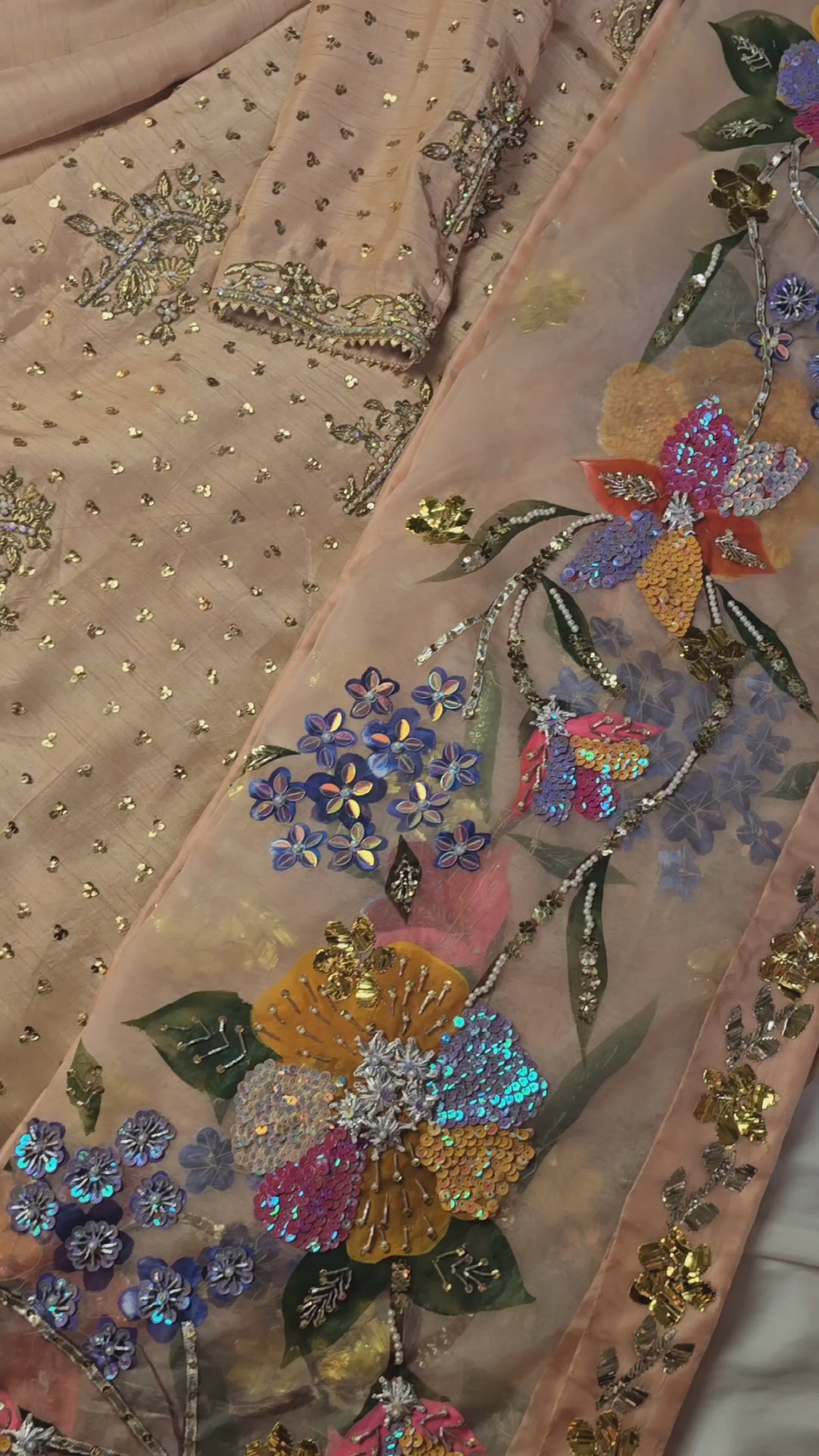 This elegant Korean raw silk shirt, adorned with fine handwork, is paired with simple trousers for a sleek silhouette. The look is completed with a beautifully hand-painted, embellished organza dupatta, featuring intricate kamdani work on the border, adding a touch of artistry and grace.