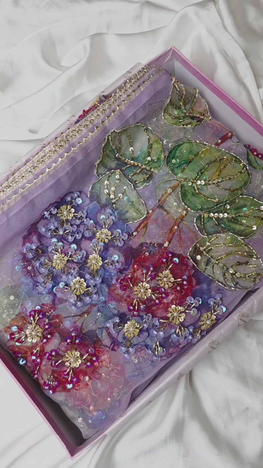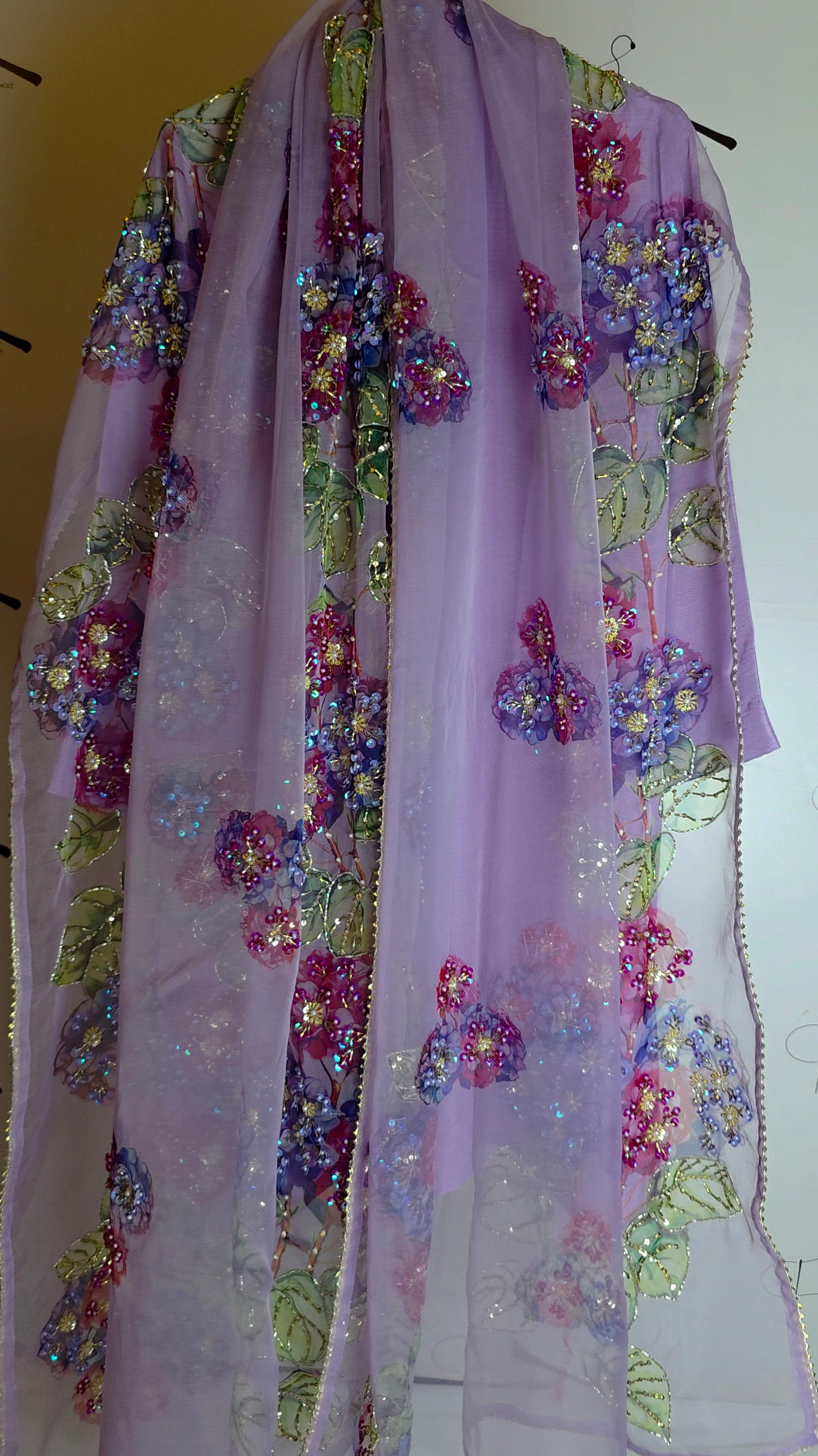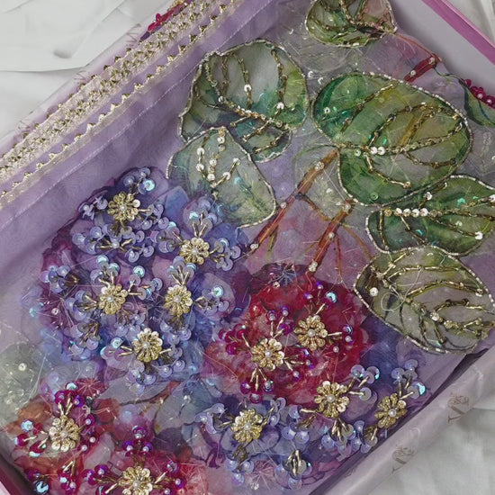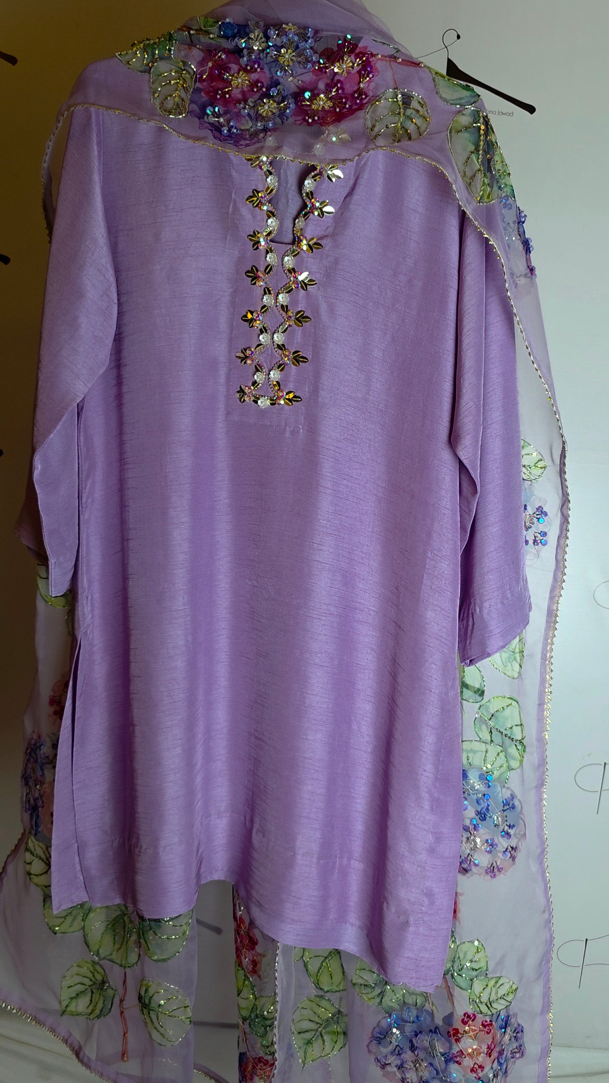 Radiating subtle charm, this Lilac suit is a vision of modern elegance. The shirt and trousers are crafted from smooth Korean raw silk, providing a graceful, understated base. The centerpiece is the exquisite organza dupatta, featuring a stunning floral pattern that has been meticulously screen-printed and finished with delicate hand embellishments that shimmer beautifully.