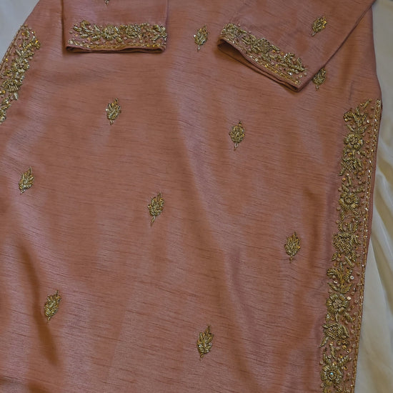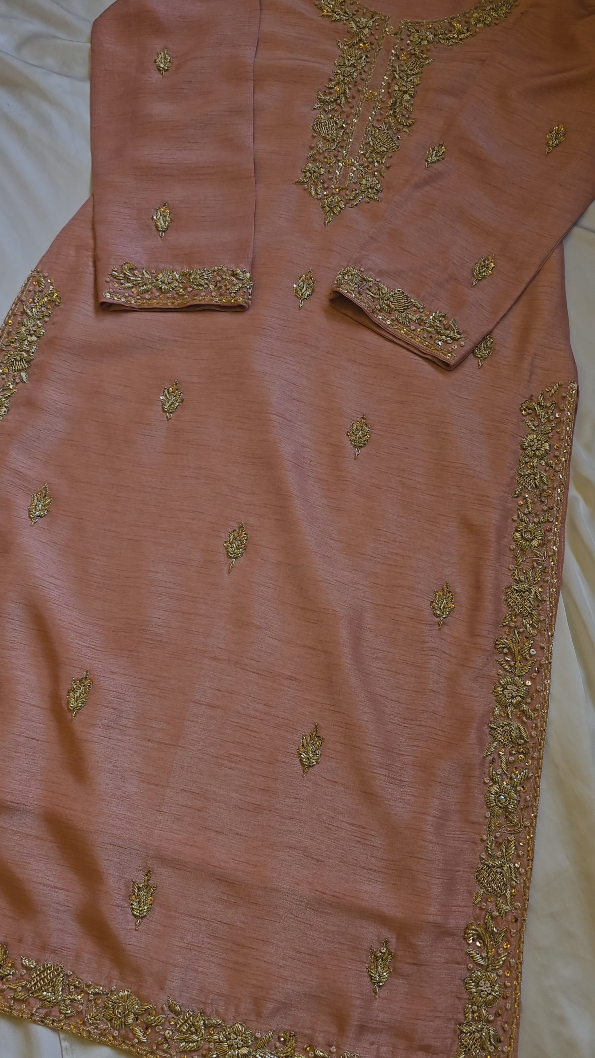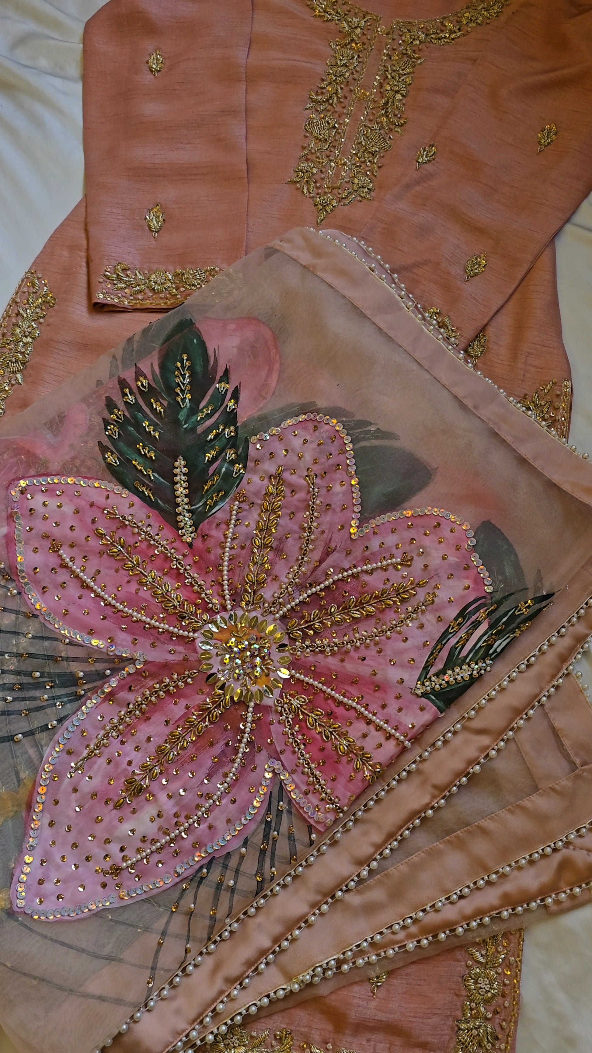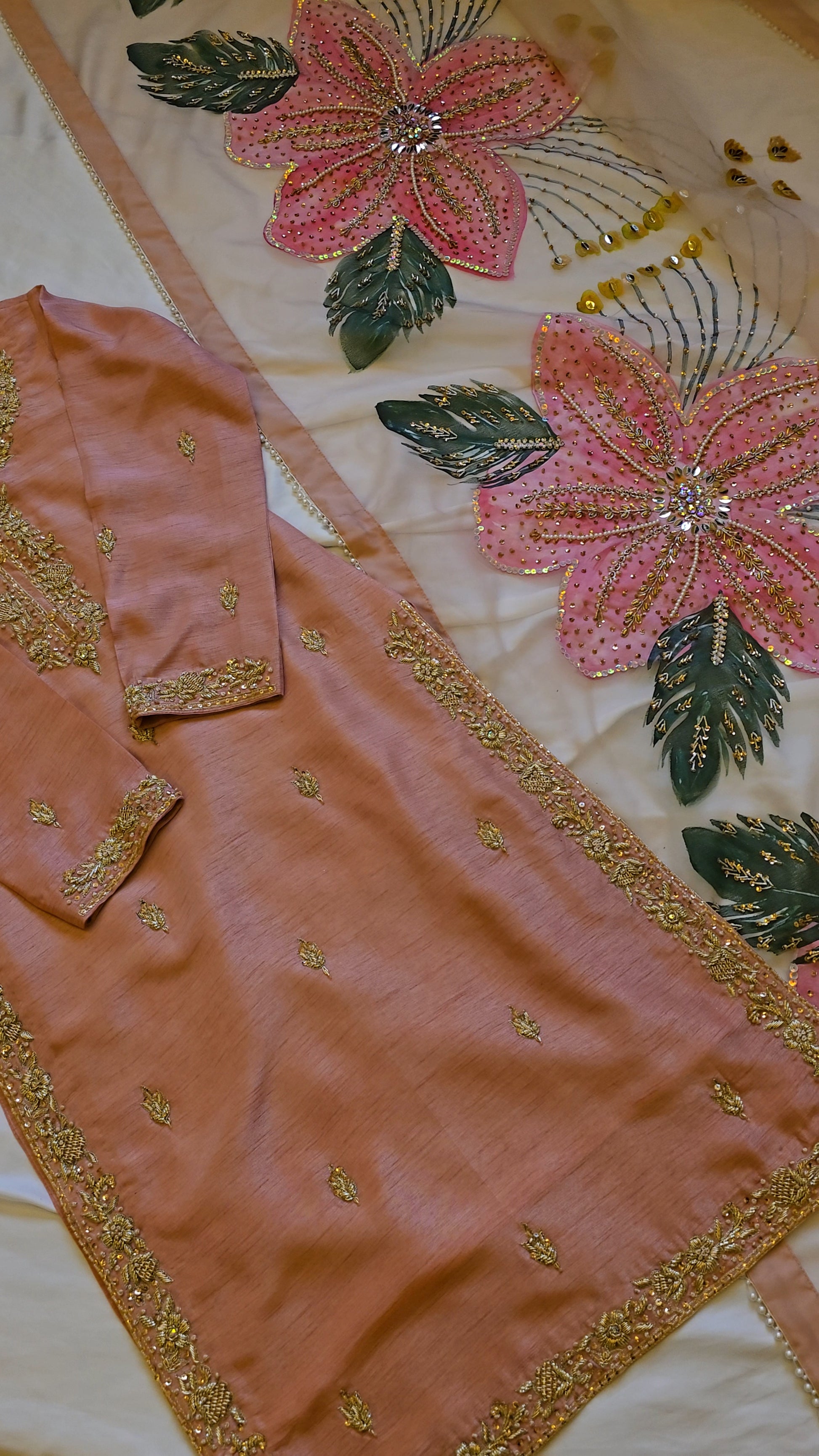 This luxurious Korean Raw Silk Shirt features exquisite Zardozi work, offering timeless elegance. Paired with a simple, stylish plain trouser, the set is completed by a stunning Organza dupatta that’s both hand-painted and hand-embellished, adding an artistic, refined touch. Perfect for festive or formal events.