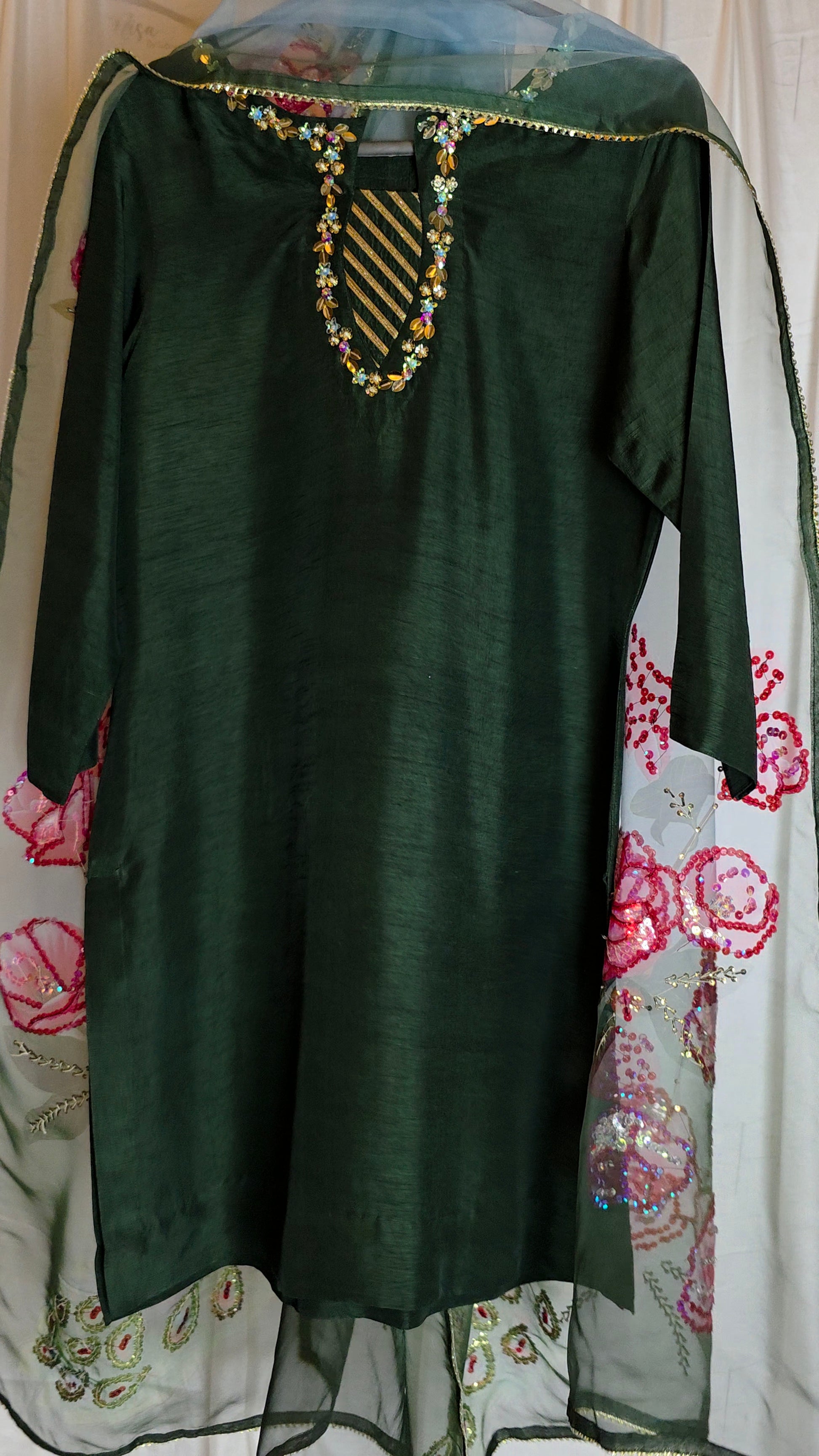 A chic short shirt and farshi shalwar set in premium Korean raw silk, blending tradition with modern flair. Paired with a flowing organza dupatta, beautifully screen-printed for a soft, artistic finish. Ideal for festive gatherings and graceful daywear.