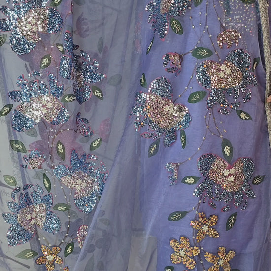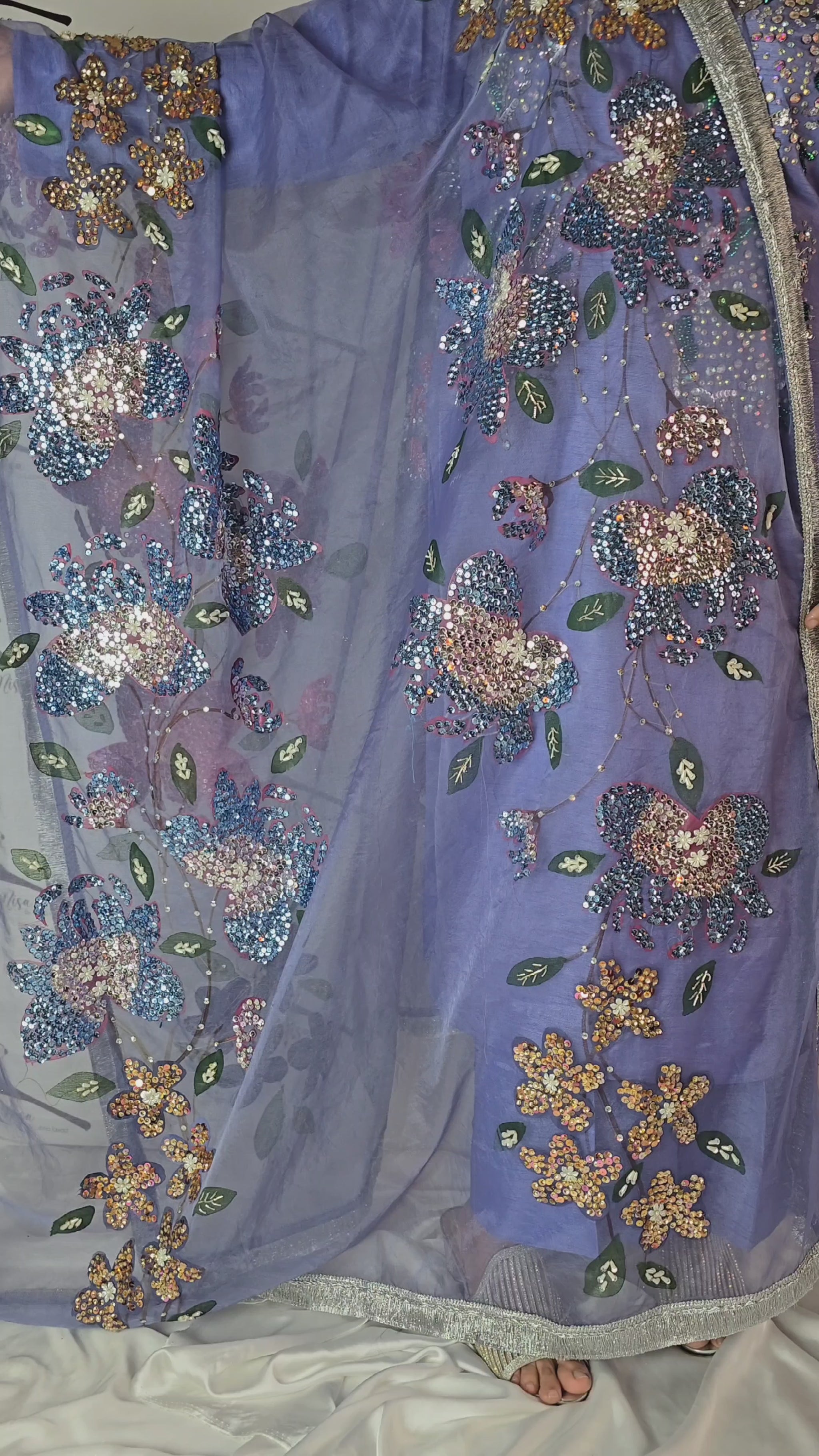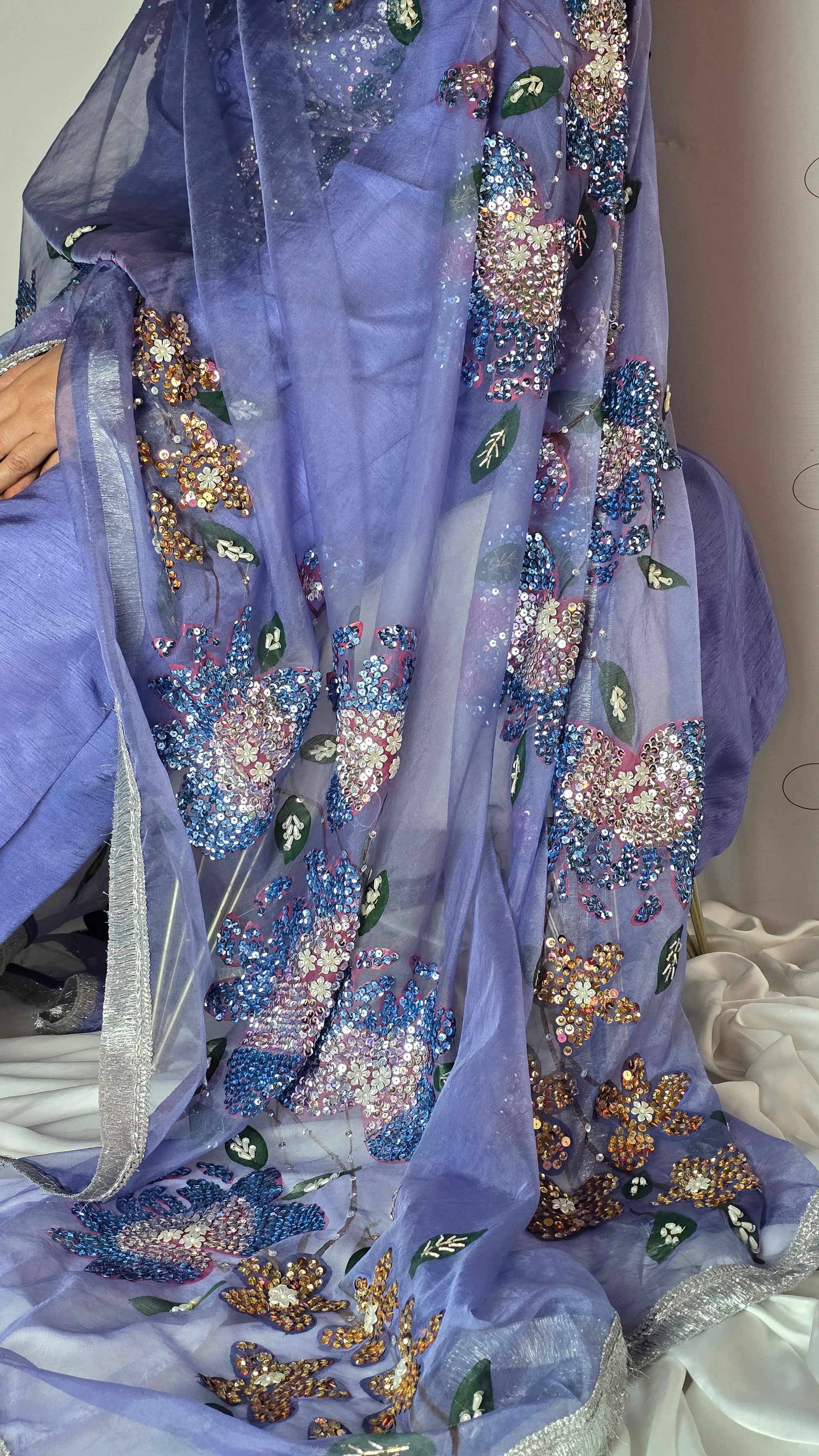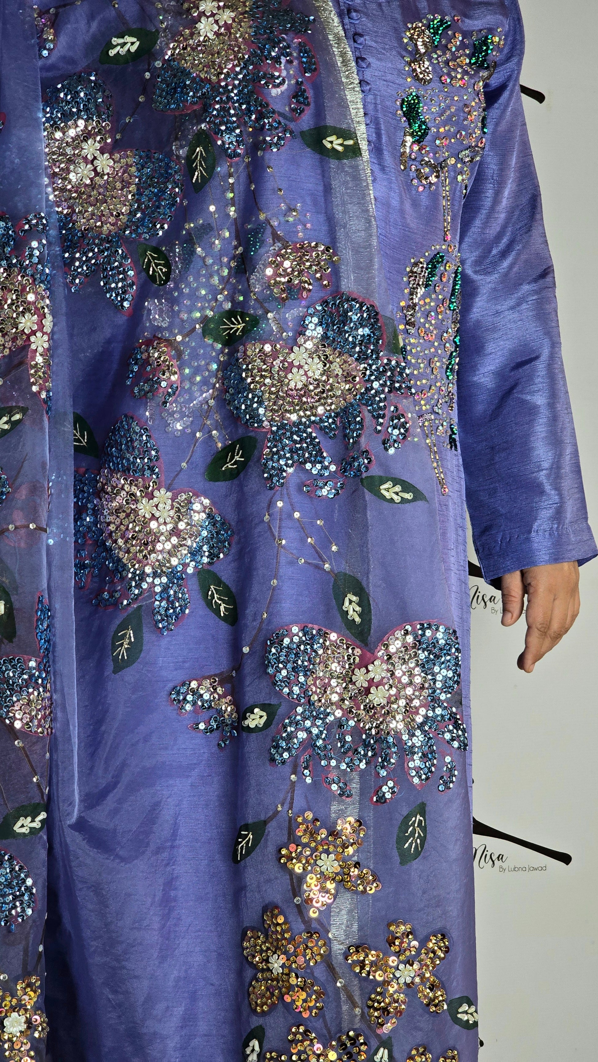 This elegant Korean raw silk shirt, adorned with fine handwork, is paired with simple trousers for a sleek silhouette. The look is completed with a beautifully hand-painted, embellished organza dupatta, adding a touch of artistry and grace.