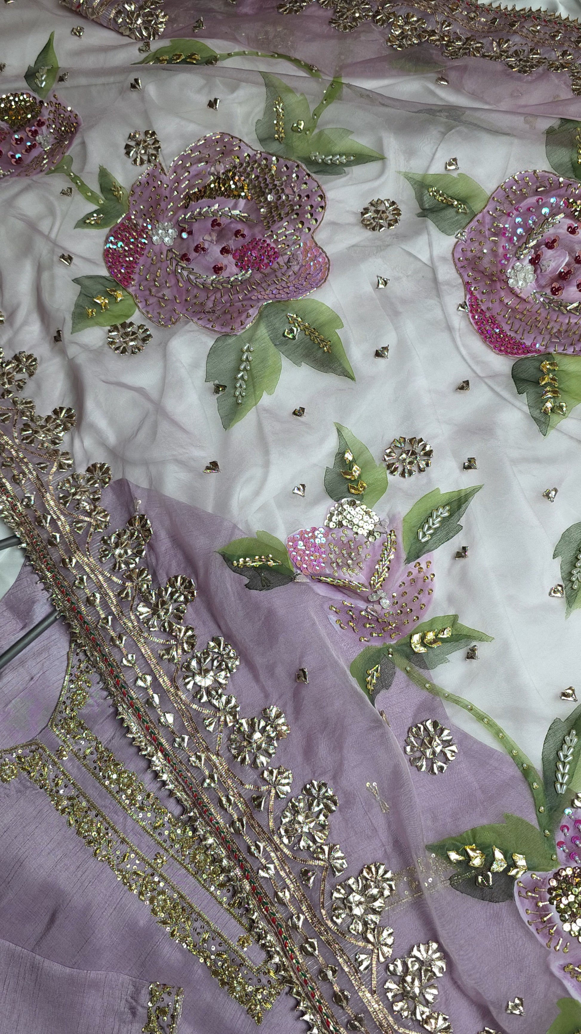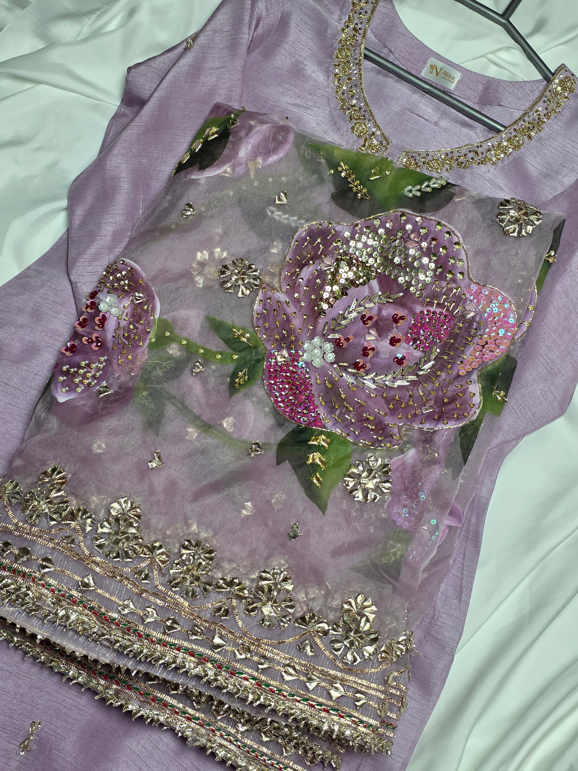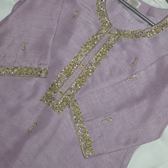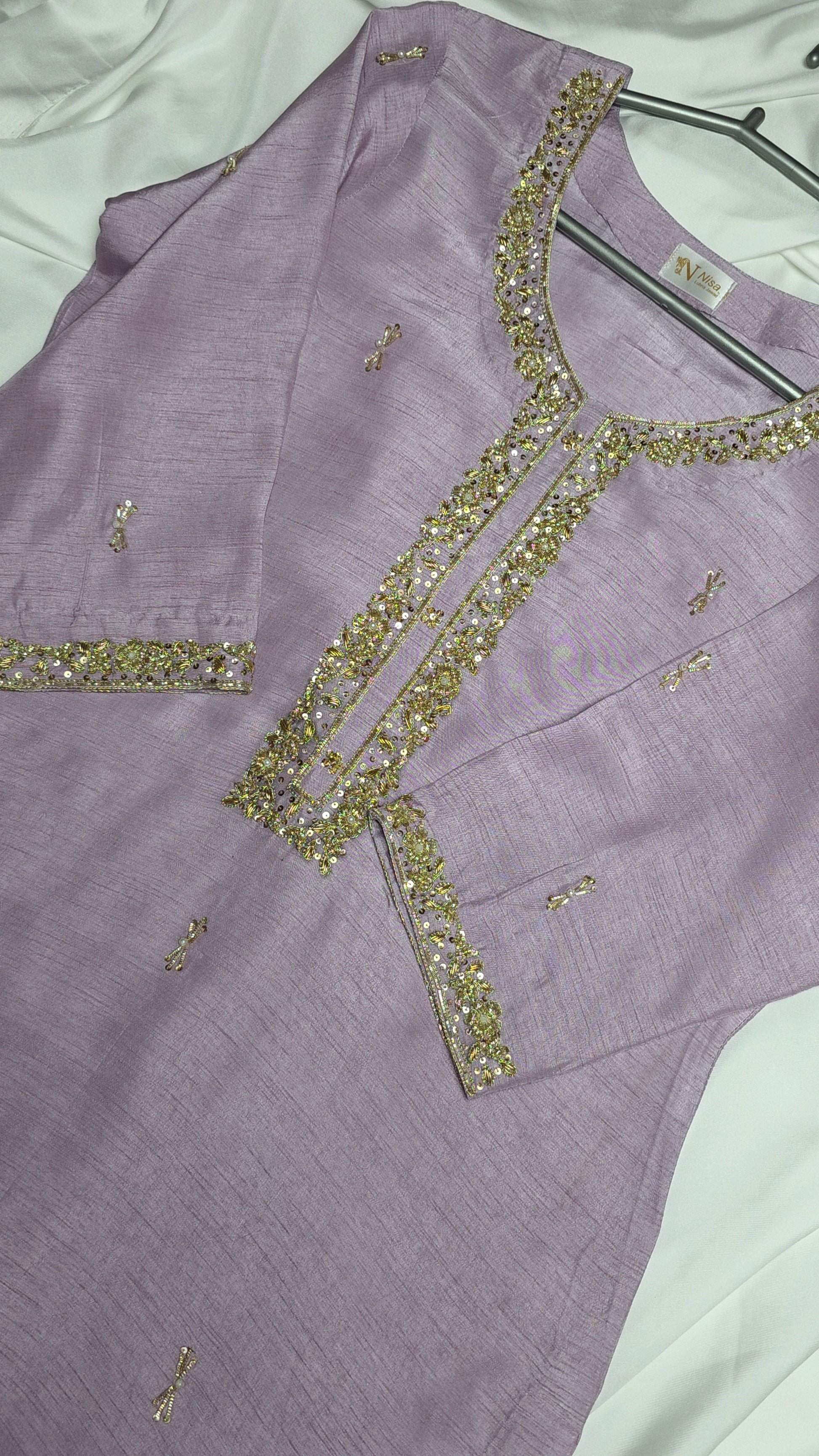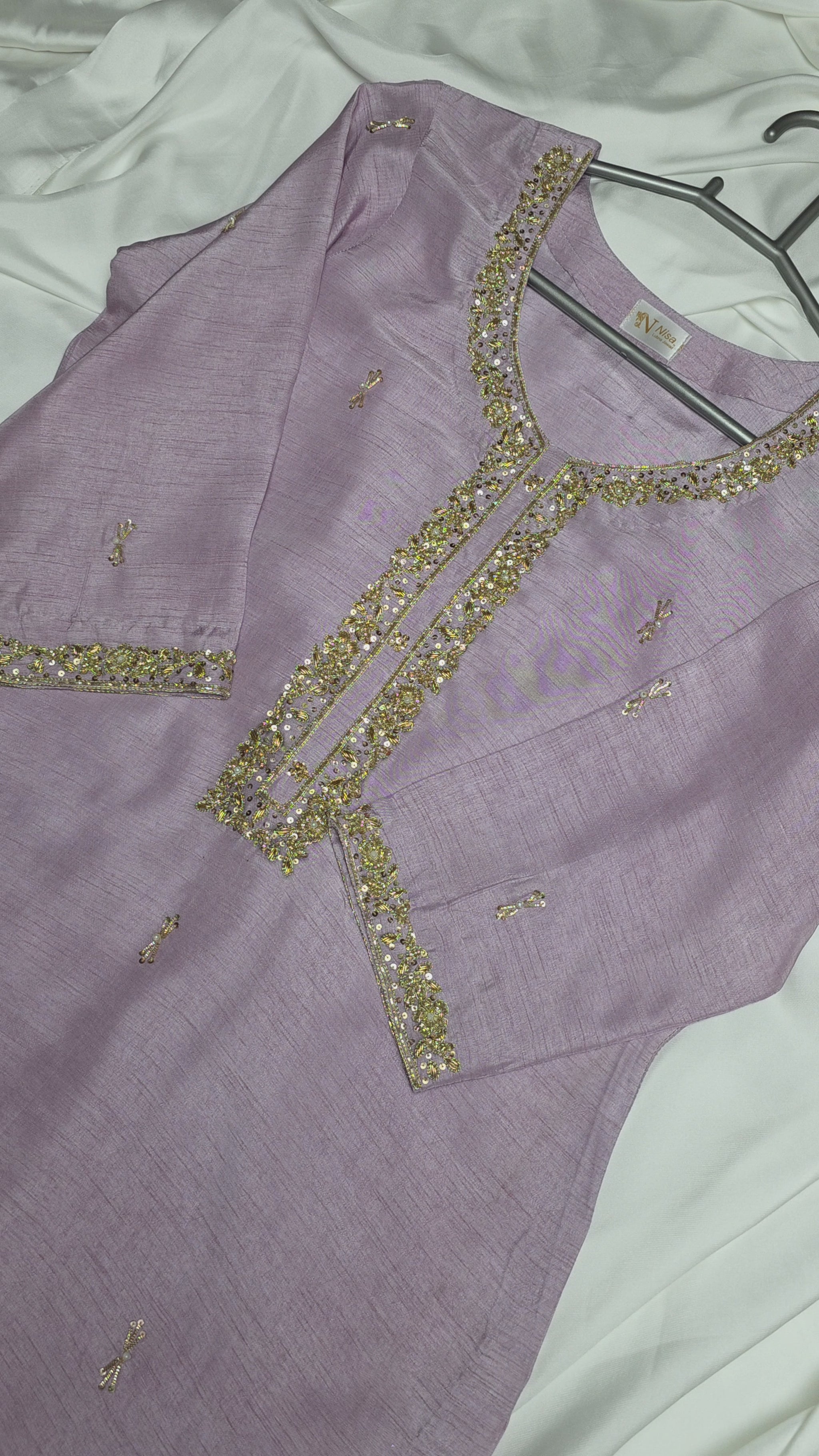 This elegant Korean raw silk suit features a beautifully embellished neckline with intricate kora work, adding a touch of tradition and luxury.