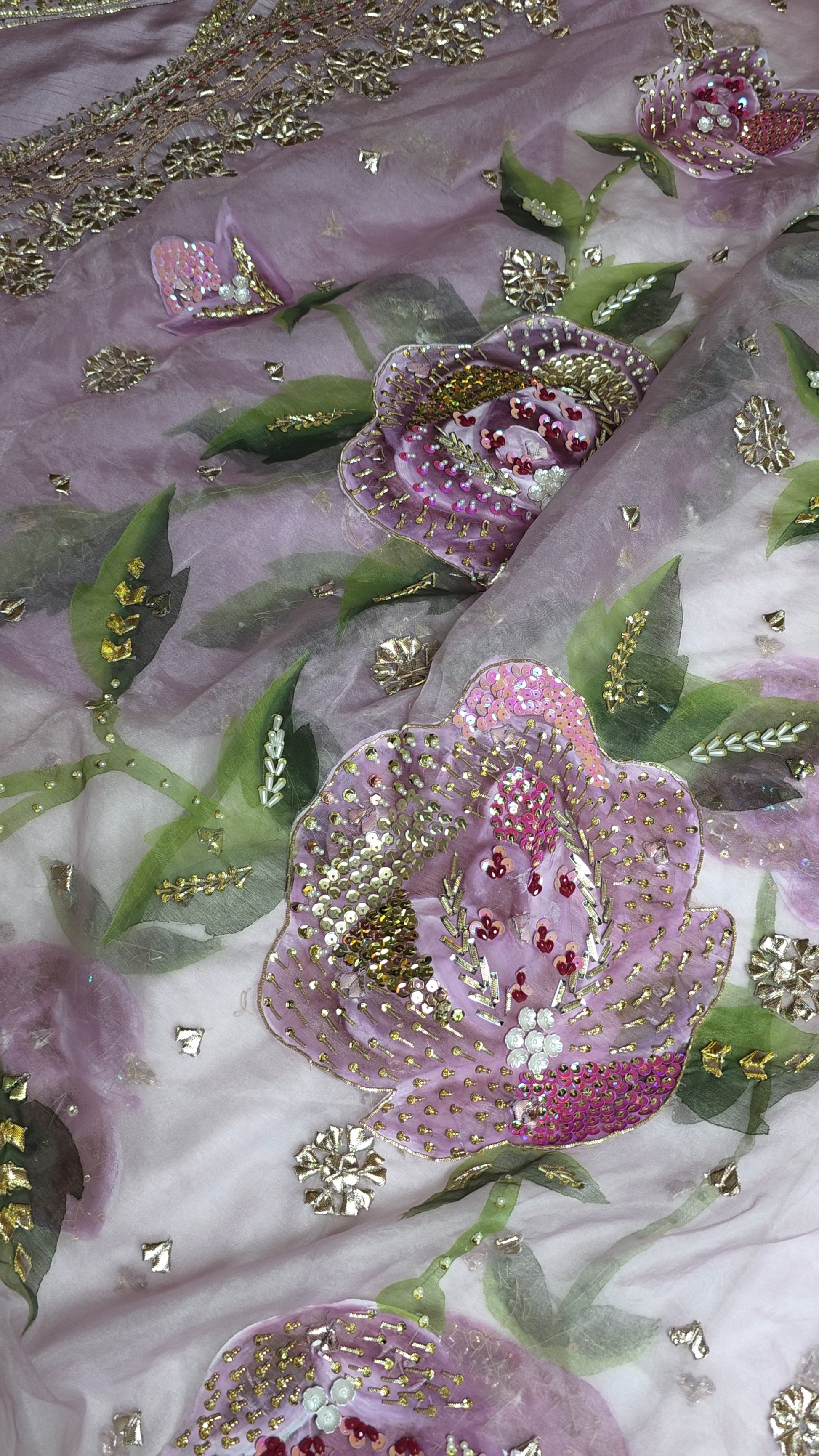 The outfit comes with plain trousers and a four-sided gota border dupatta, hand-painted and hand-embellished for an artistic and refined touch.