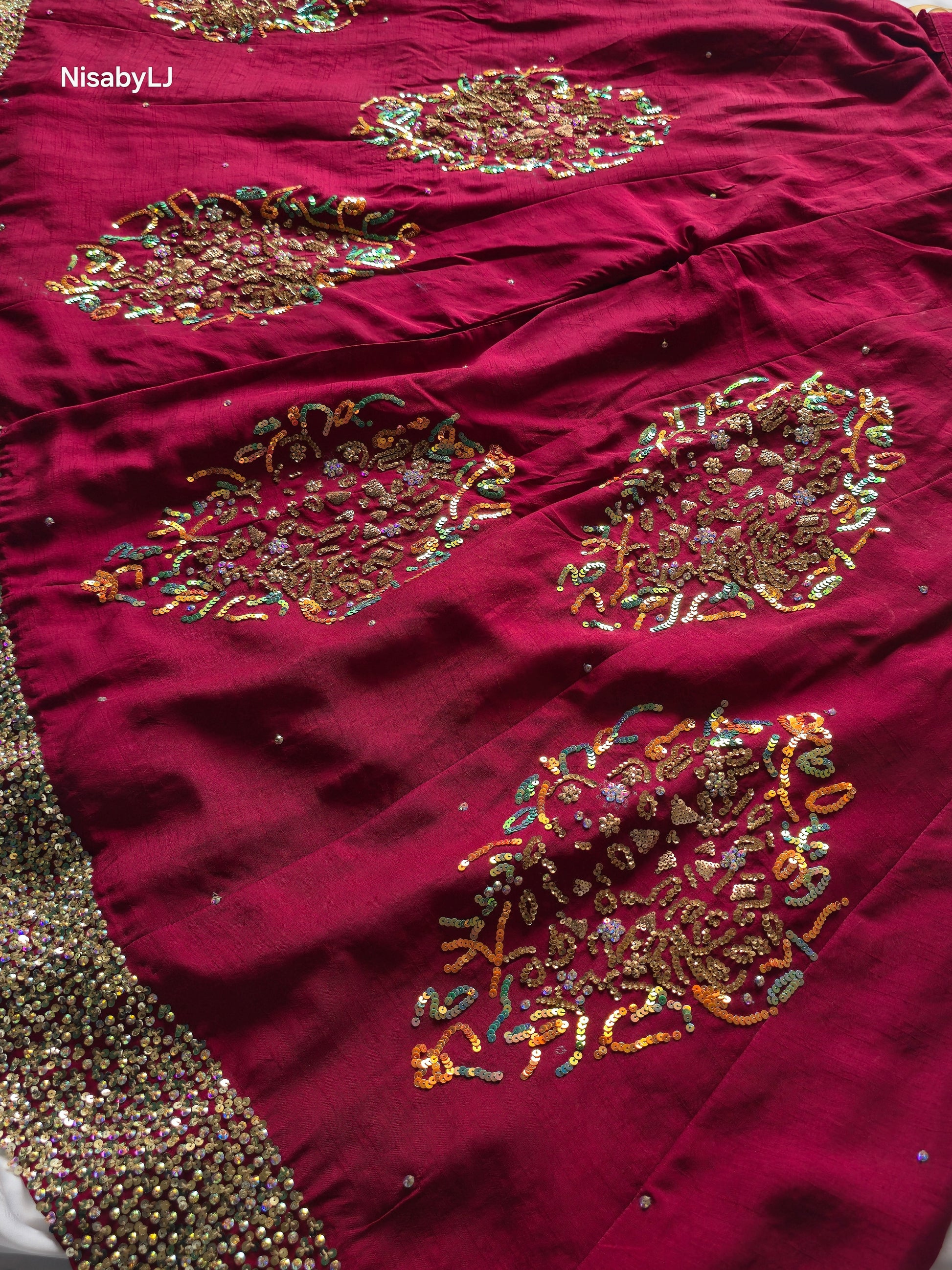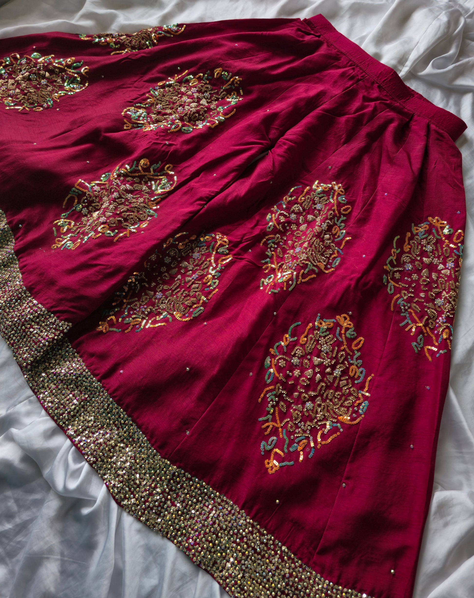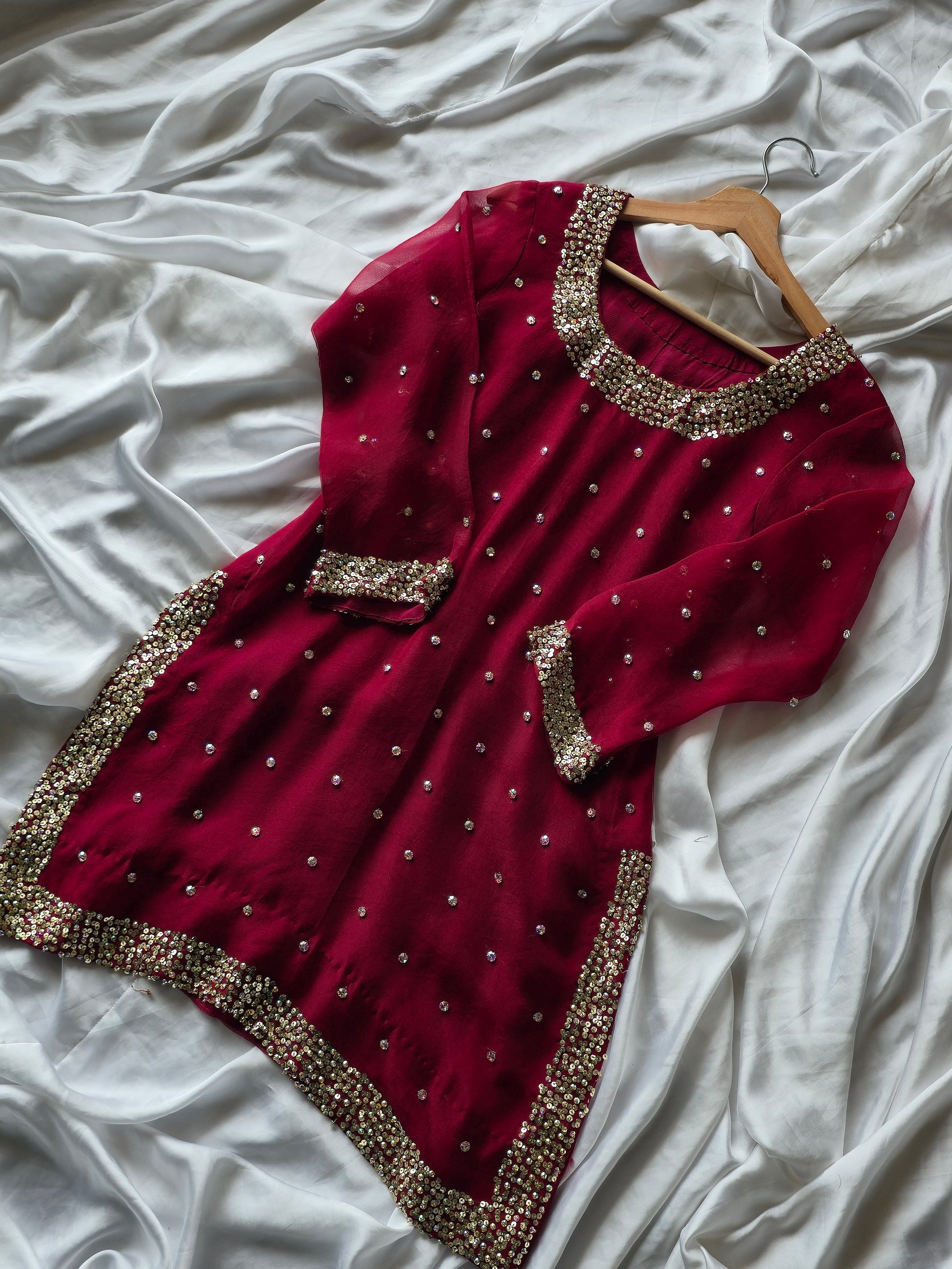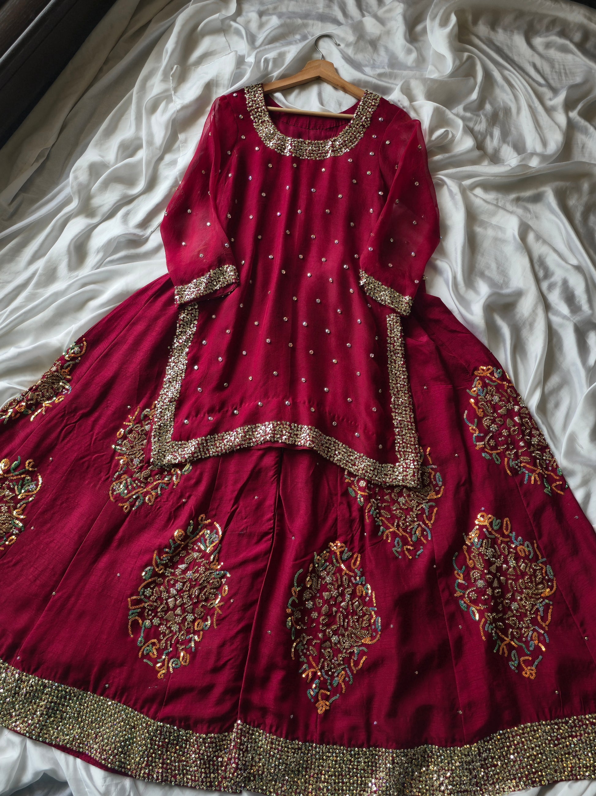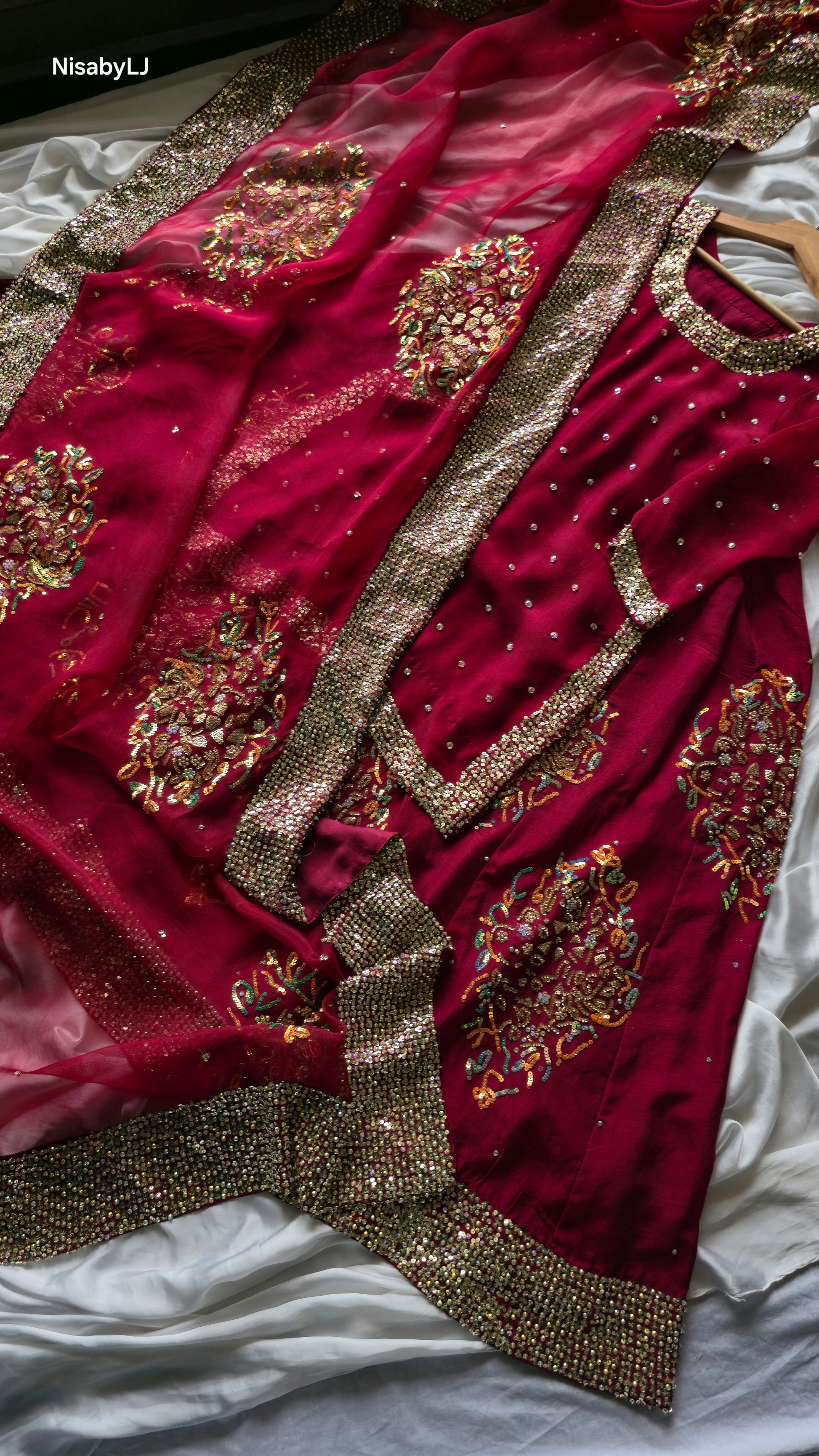 Captivating in crimson, 'Rahaab' presents a vision of timeless sophistication. This exquisite three-piece formal ensemble features a shirt, sharara and dupatta crafted from the purest organza, in a rich, vibrant red. The shirt is delicately embellished with intricate golden embroidery and shimmering accents, while the dupatta boasts coordinating motifs and a beautifully detailed border, exuding an air of classic elegance. Perfect for making a memorable statement at any special occasion.