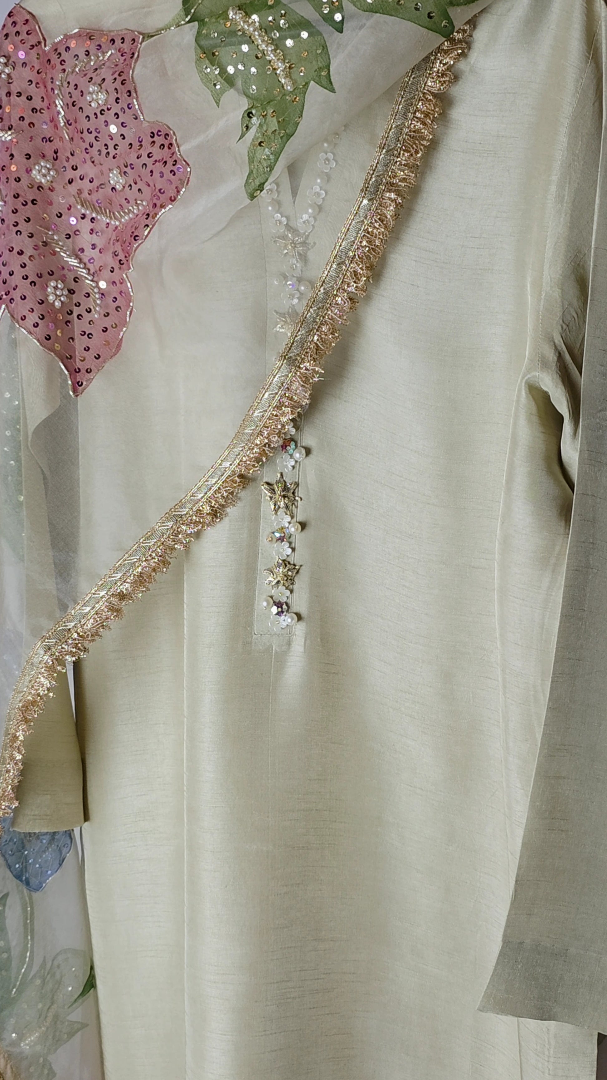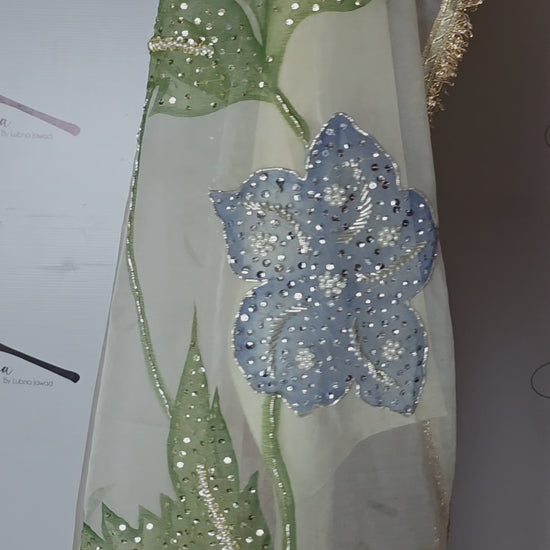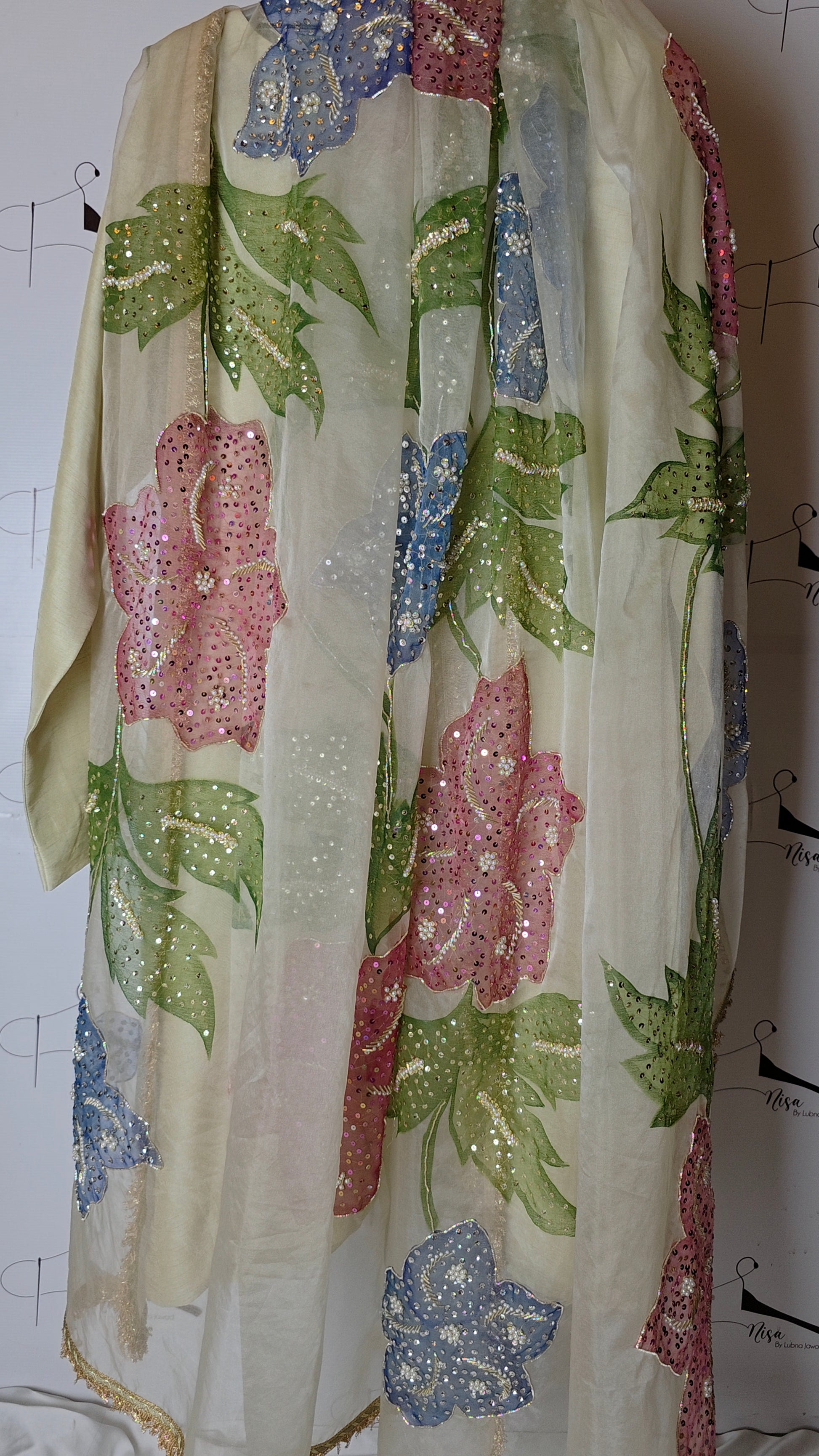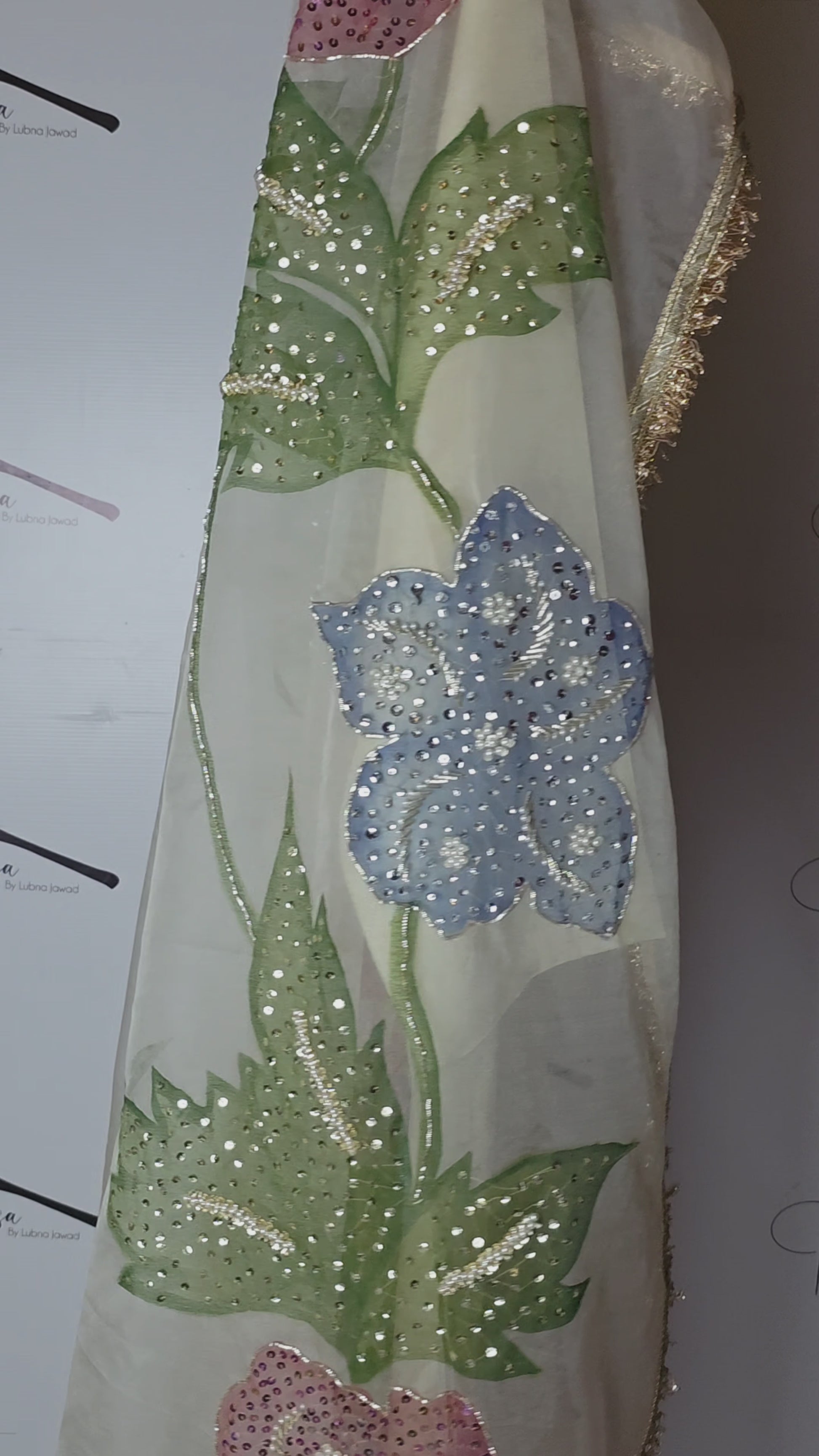 The standout feature is the hand-painted, hand-embellished dupatta, offering a perfect blend of artistry and elegance.