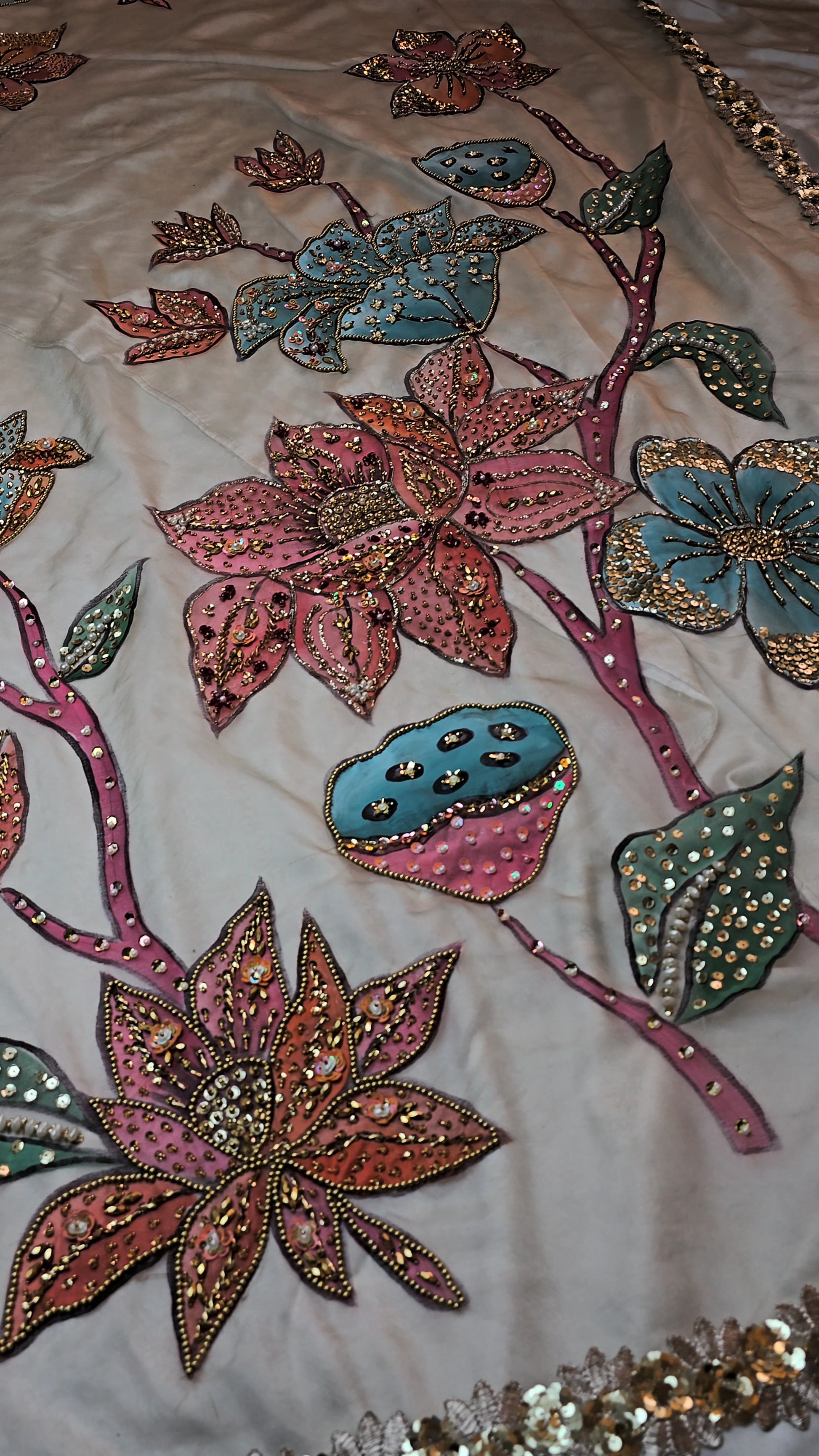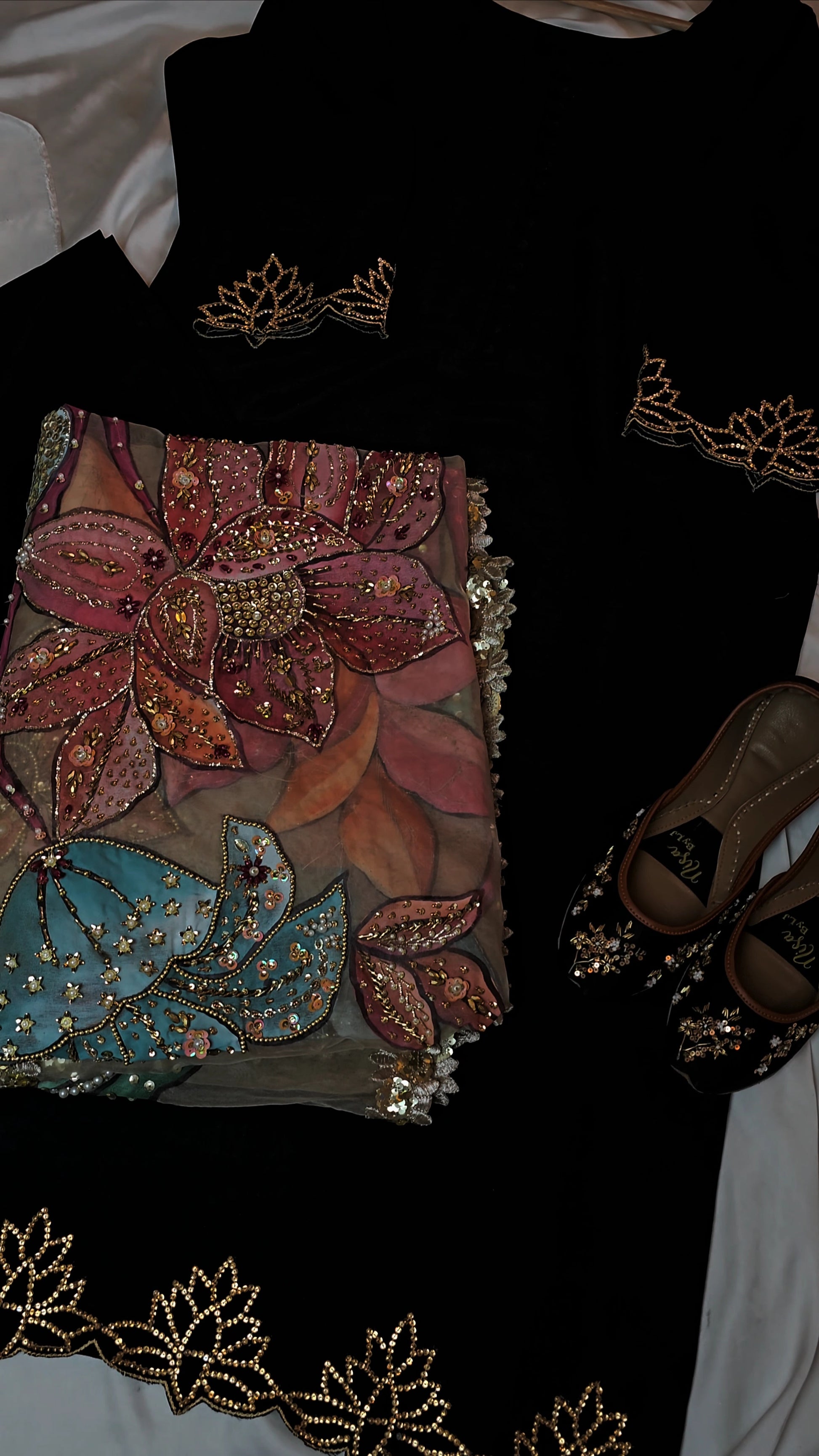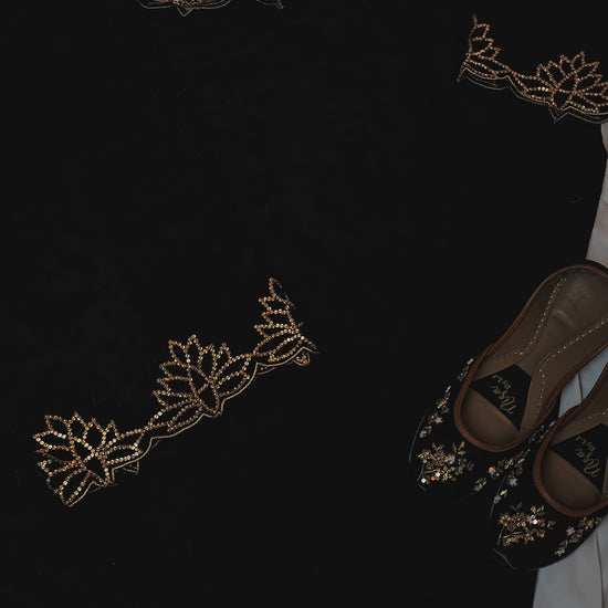 Exude elegance with this beautiful Korean Raw Silk Shirt, featuring intricate stone work details. Paired with a comfortable loose trouser, this ensemble is completed with a stunning hand-painted and hand-embellished dupatta, adding a unique artistic touch. Perfect for festive or semi-formal occasions.