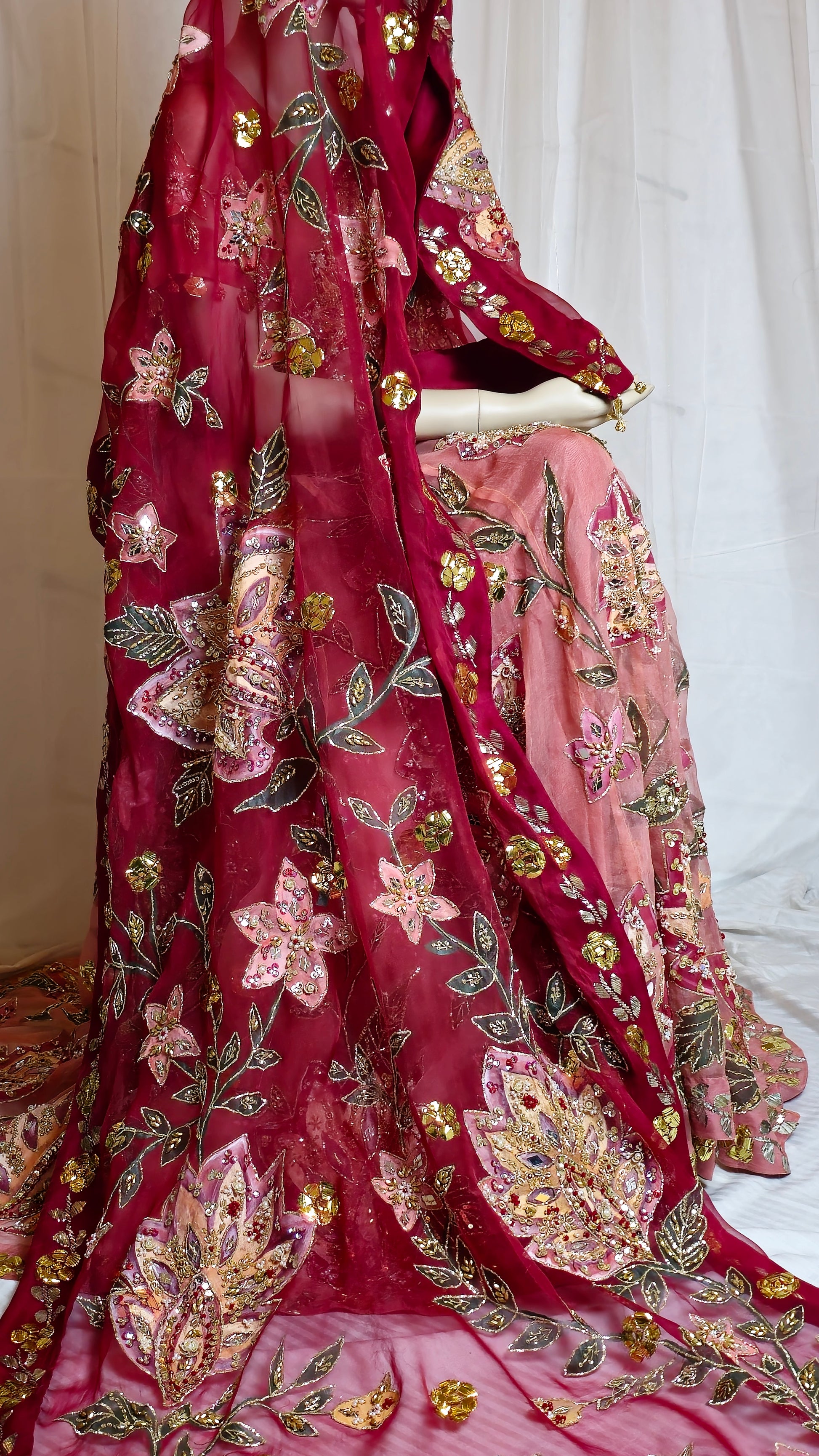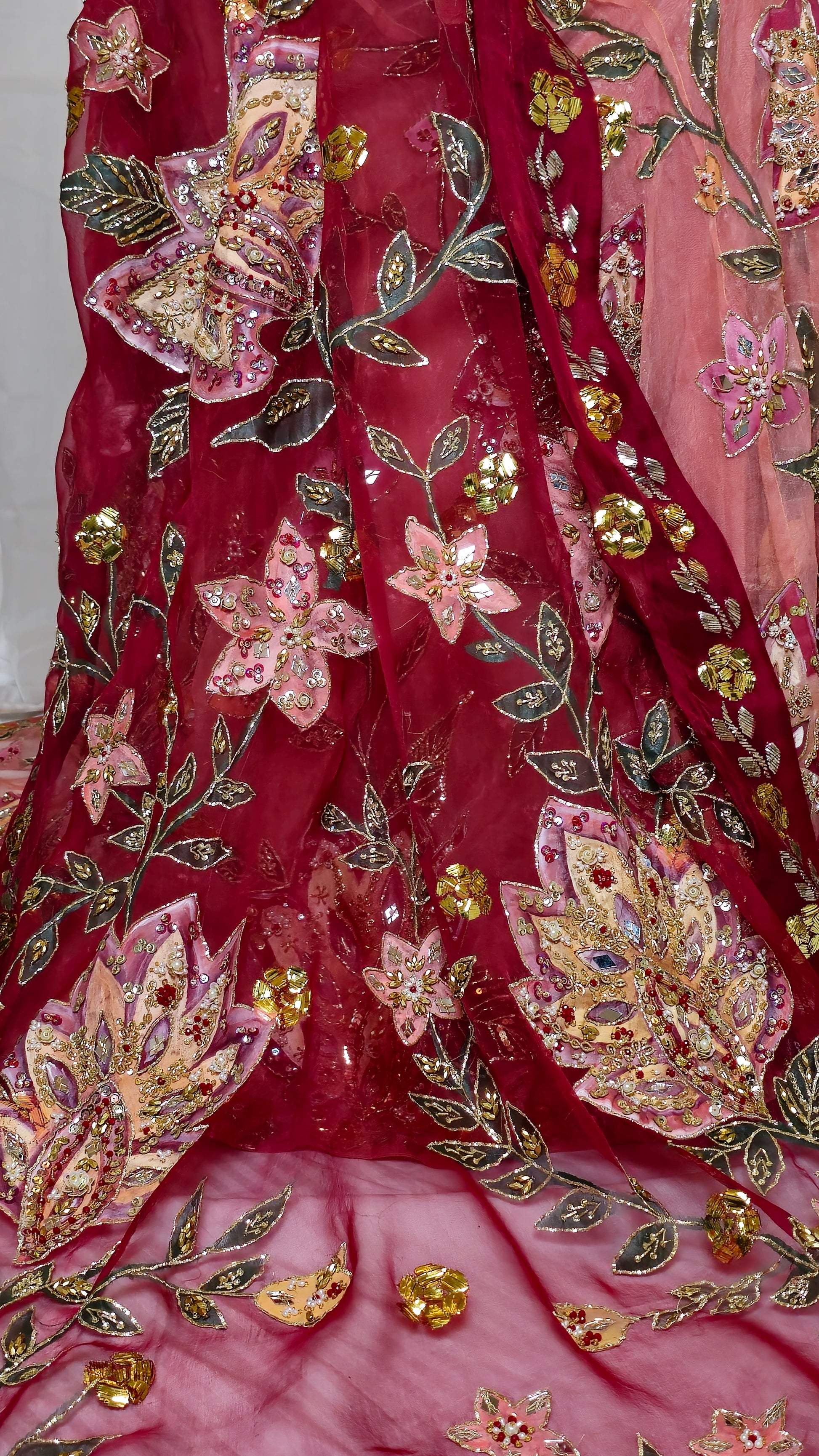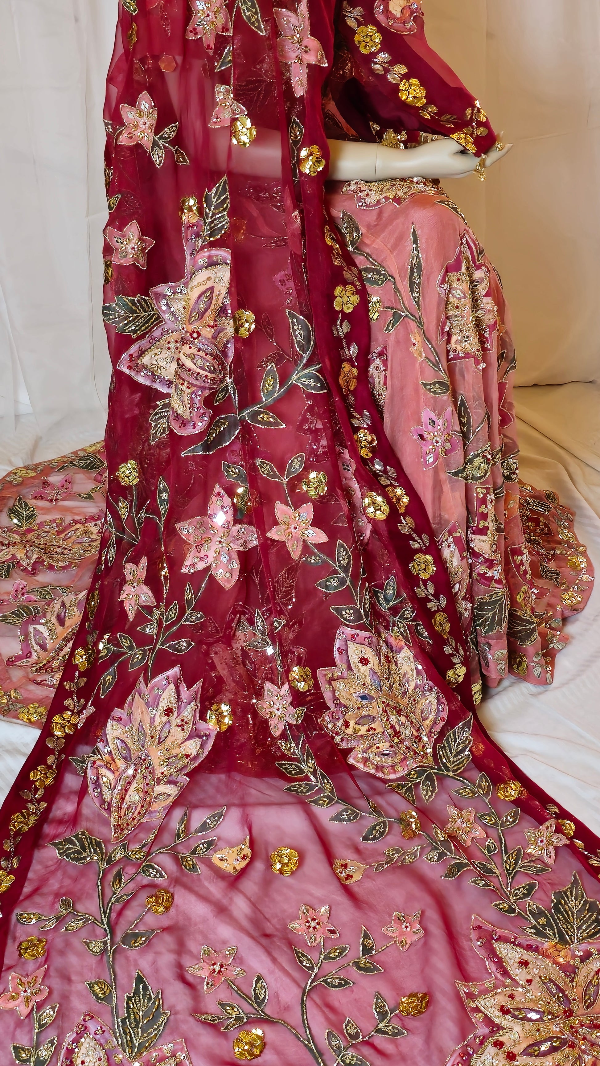 An exquisite pure organza lehnga, hand-painted and hand-embellished with detailed kamdani border work on both front and back. Paired with a matching embellished blouse and a four-sided kamdani bordered dupatta, equally adorned with handwork and painting. A timeless ensemble that blends tradition with refined artistry—perfect for weddings and festive occasions.