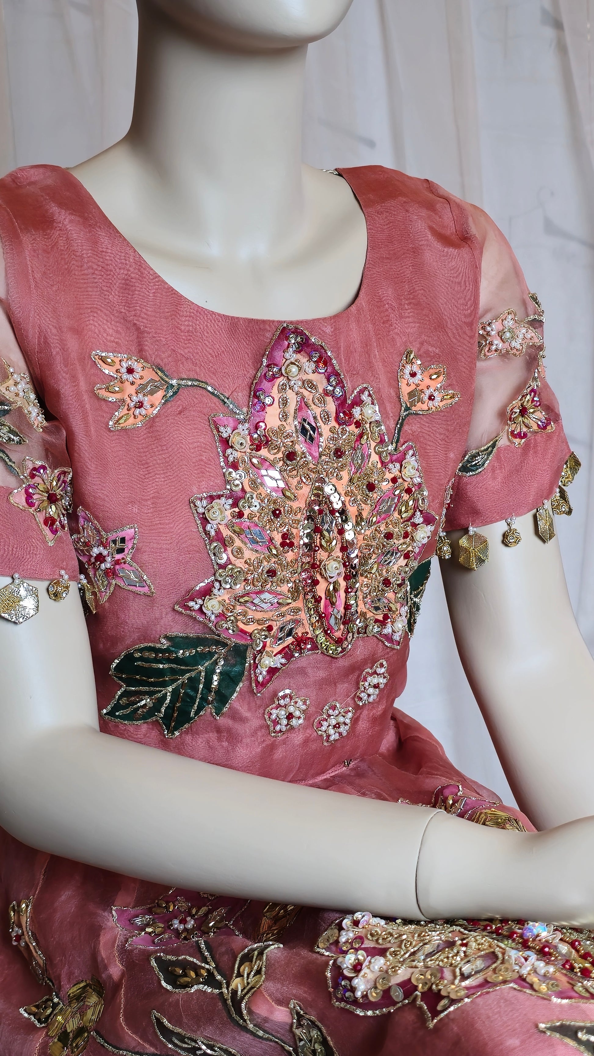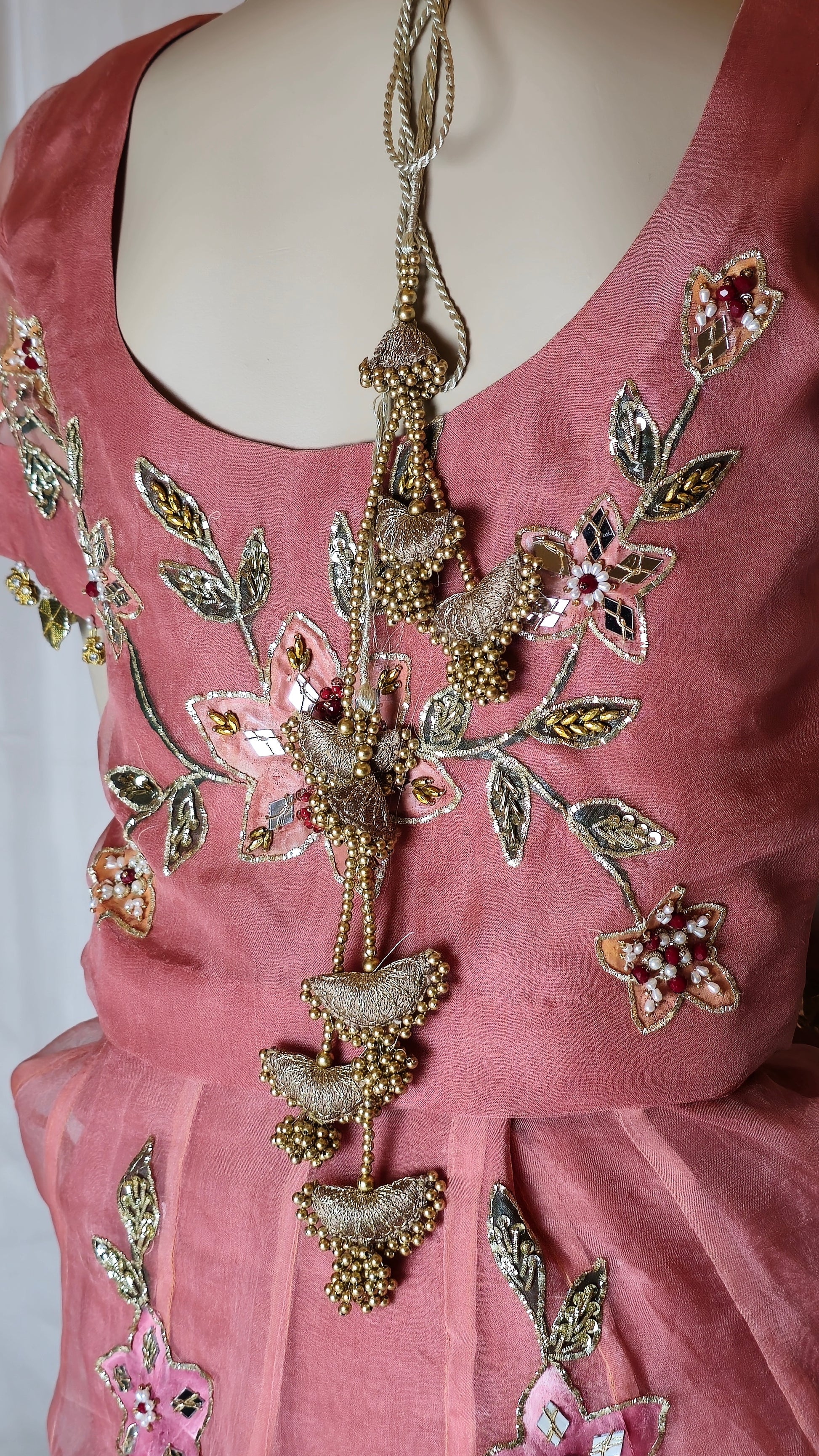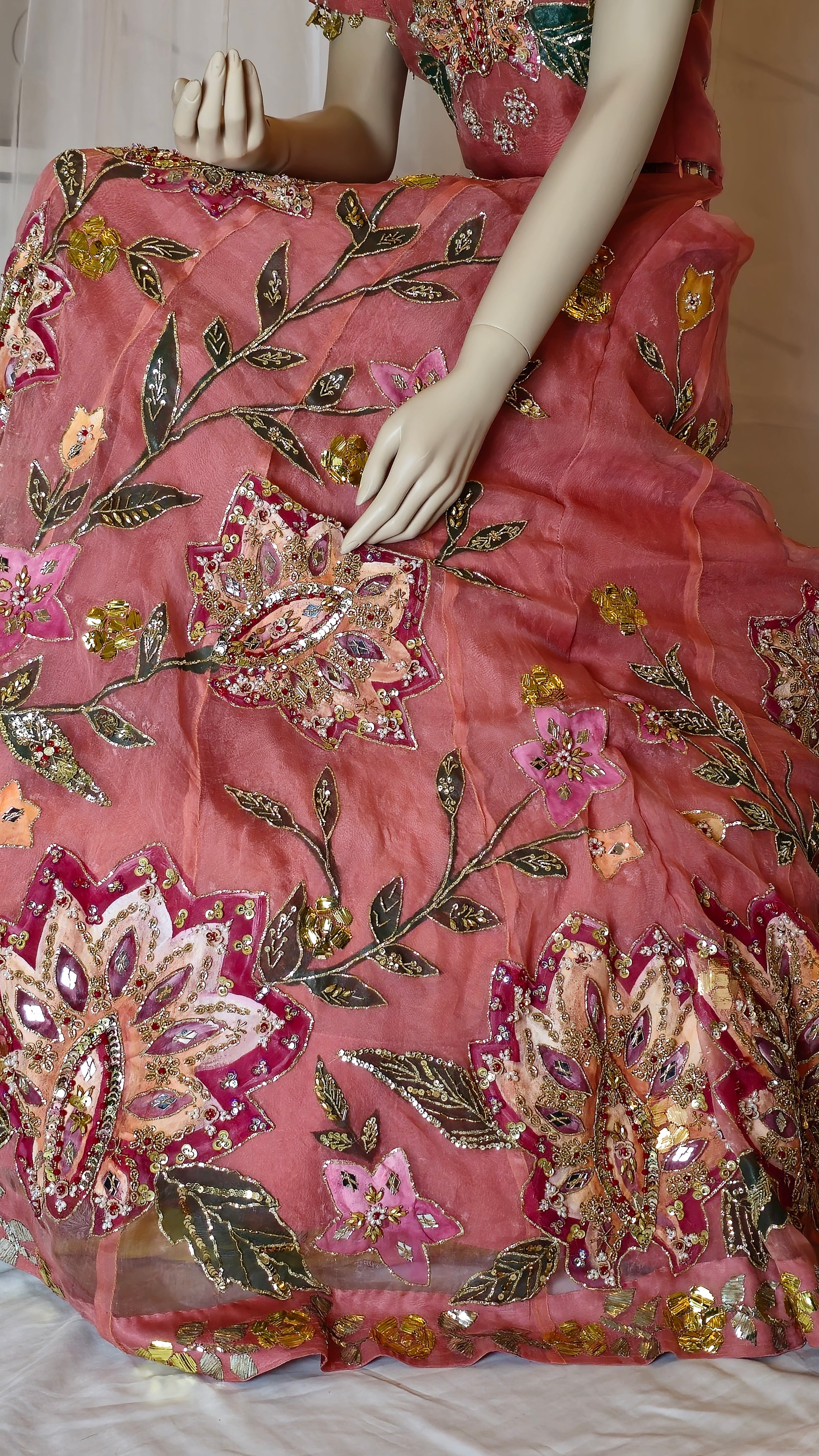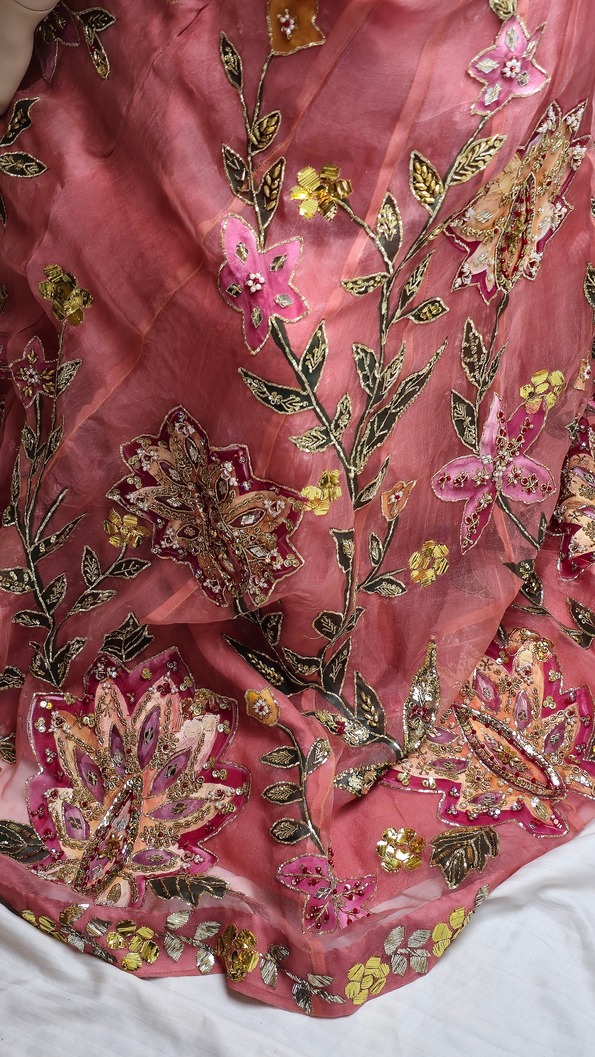 An exquisite pure organza lehnga, hand-painted and hand-embellished with detailed kamdani border work on both front and back. Paired with a matching embellished blouse and a four-sided kamdani bordered dupatta, equally adorned with handwork and painting. A timeless ensemble that blends tradition with refined artistry—perfect for weddings and festive occasions.