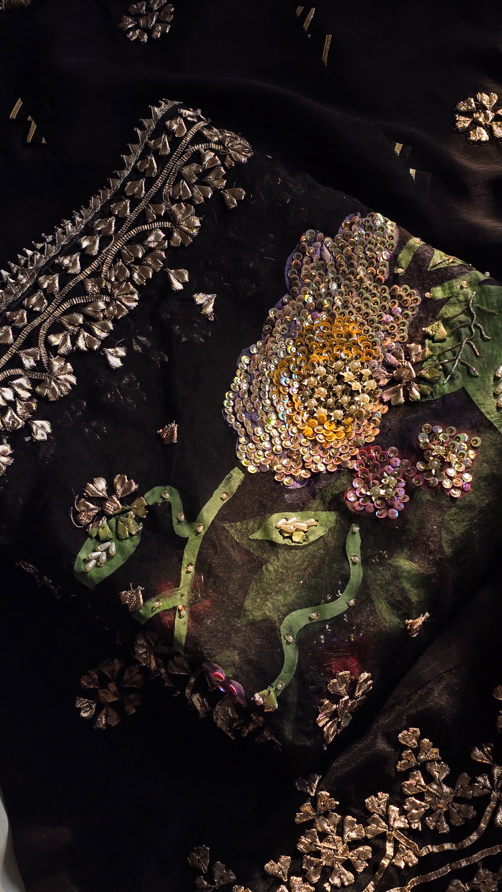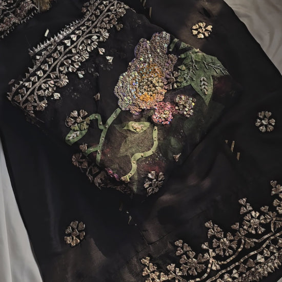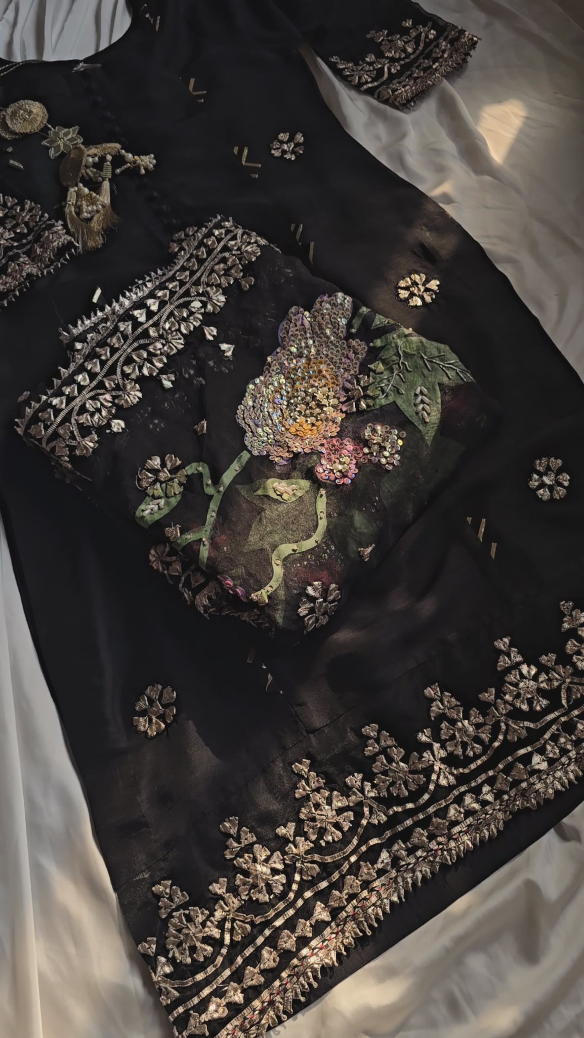 This elegant ensemble features a Korean raw silk shirt with exquisite gota organza patchwork and a tailored trouser. The organza dupatta, with a 4-sided gota border, is hand-painted and hand-embellished, adding a touch of artistry and tradition to this sophisticated look. Perfect for weddings, festive occasions, or elegant gatherings.