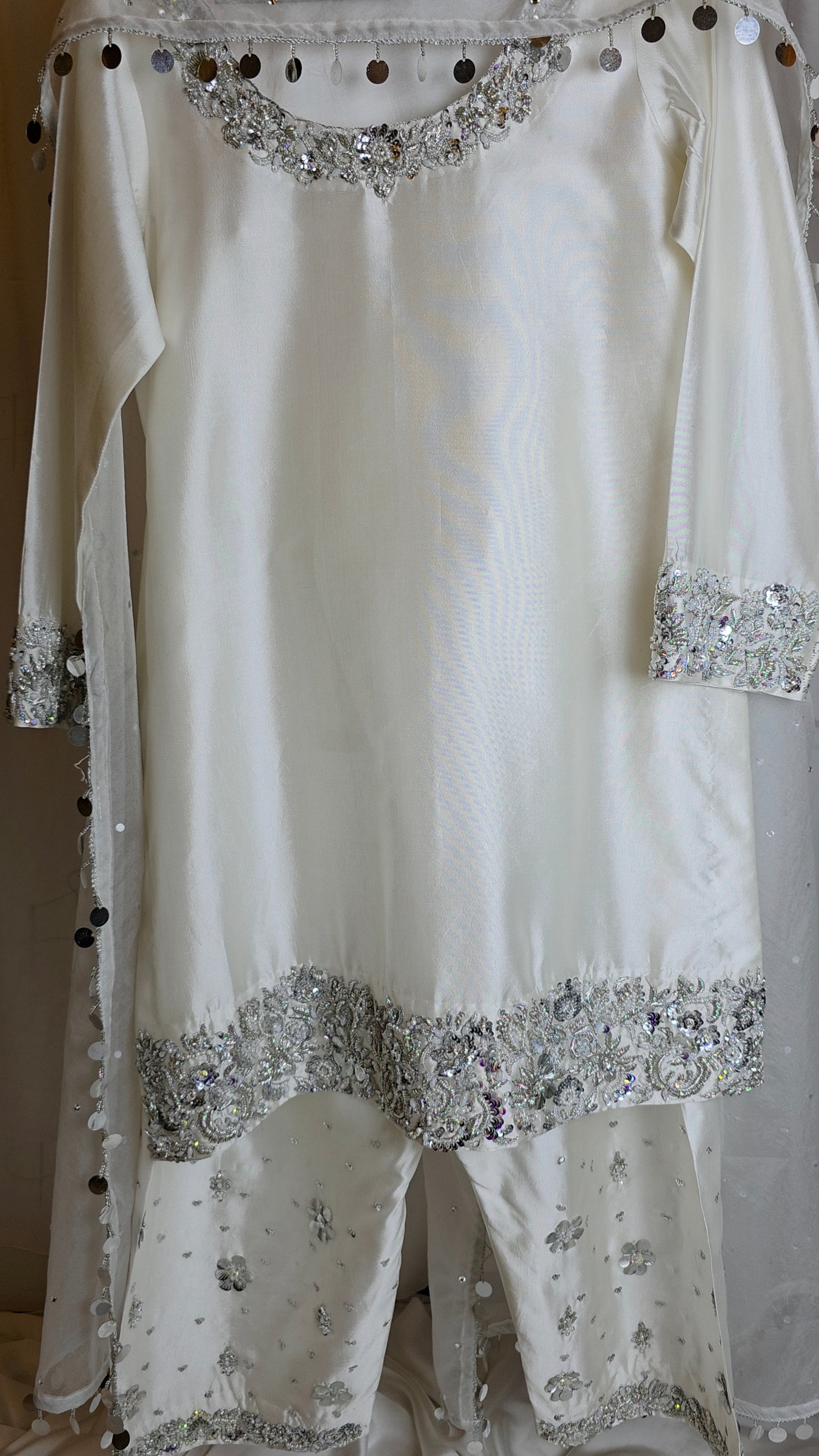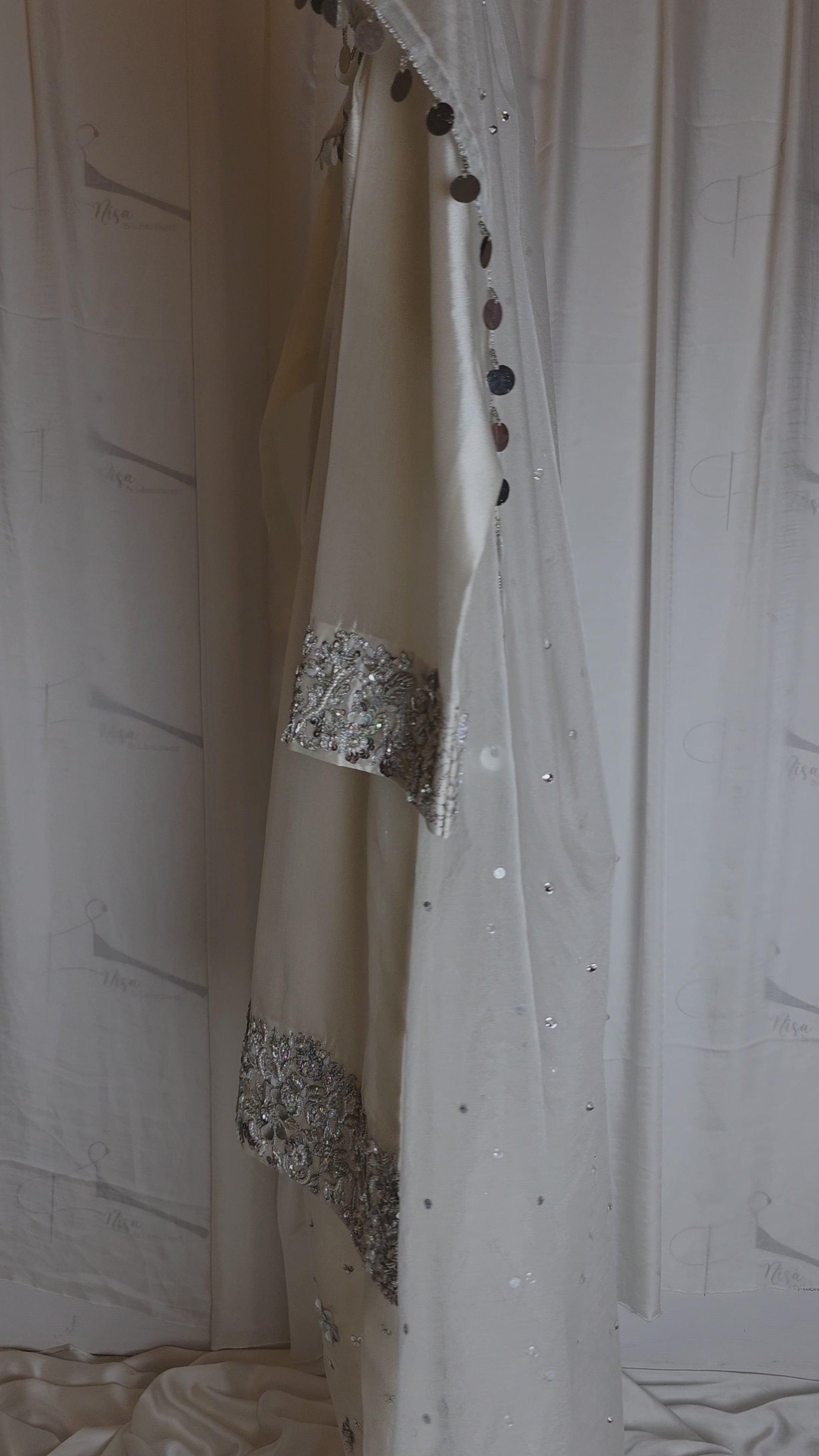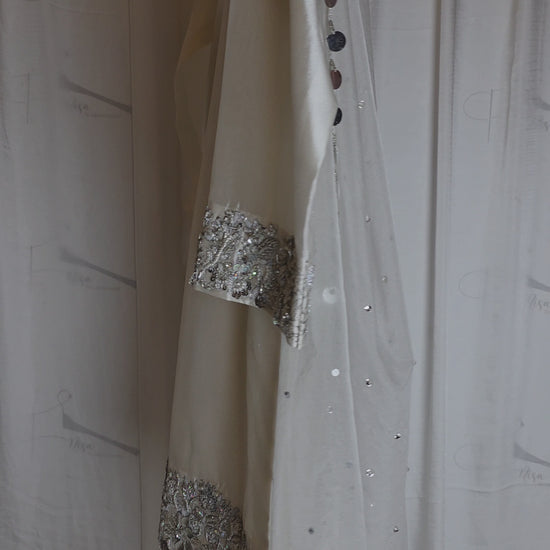 This stunning Pure Sheesha Silk Short Shirt is heavily embellished, creating a luxurious and eye-catching look. Paired with a beautifully crafted Farshi Shalwar, adorned with intricate work, and a plain organza dupatta featuring delicate lace finishing,