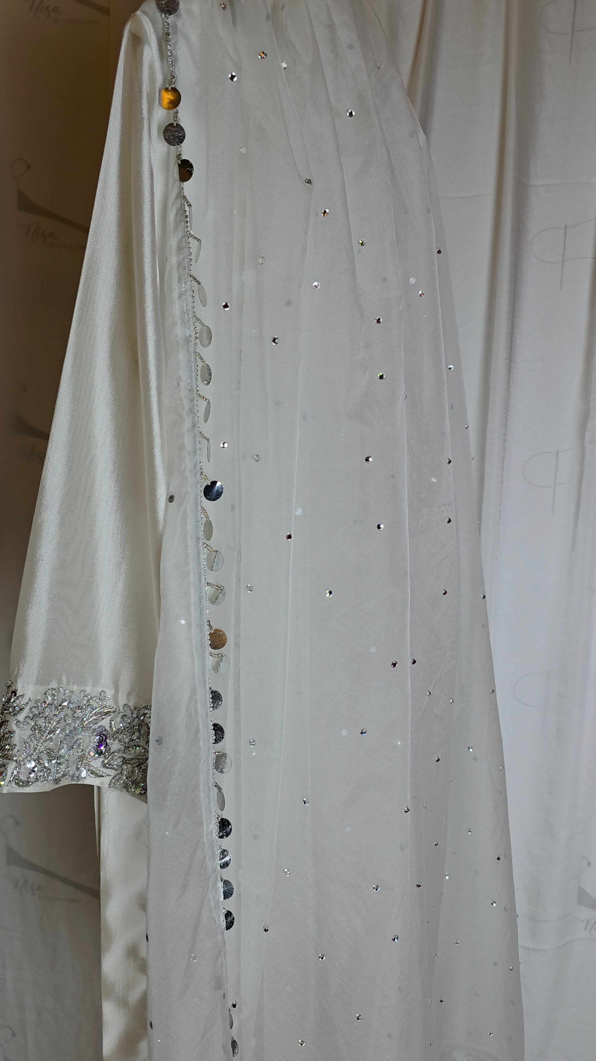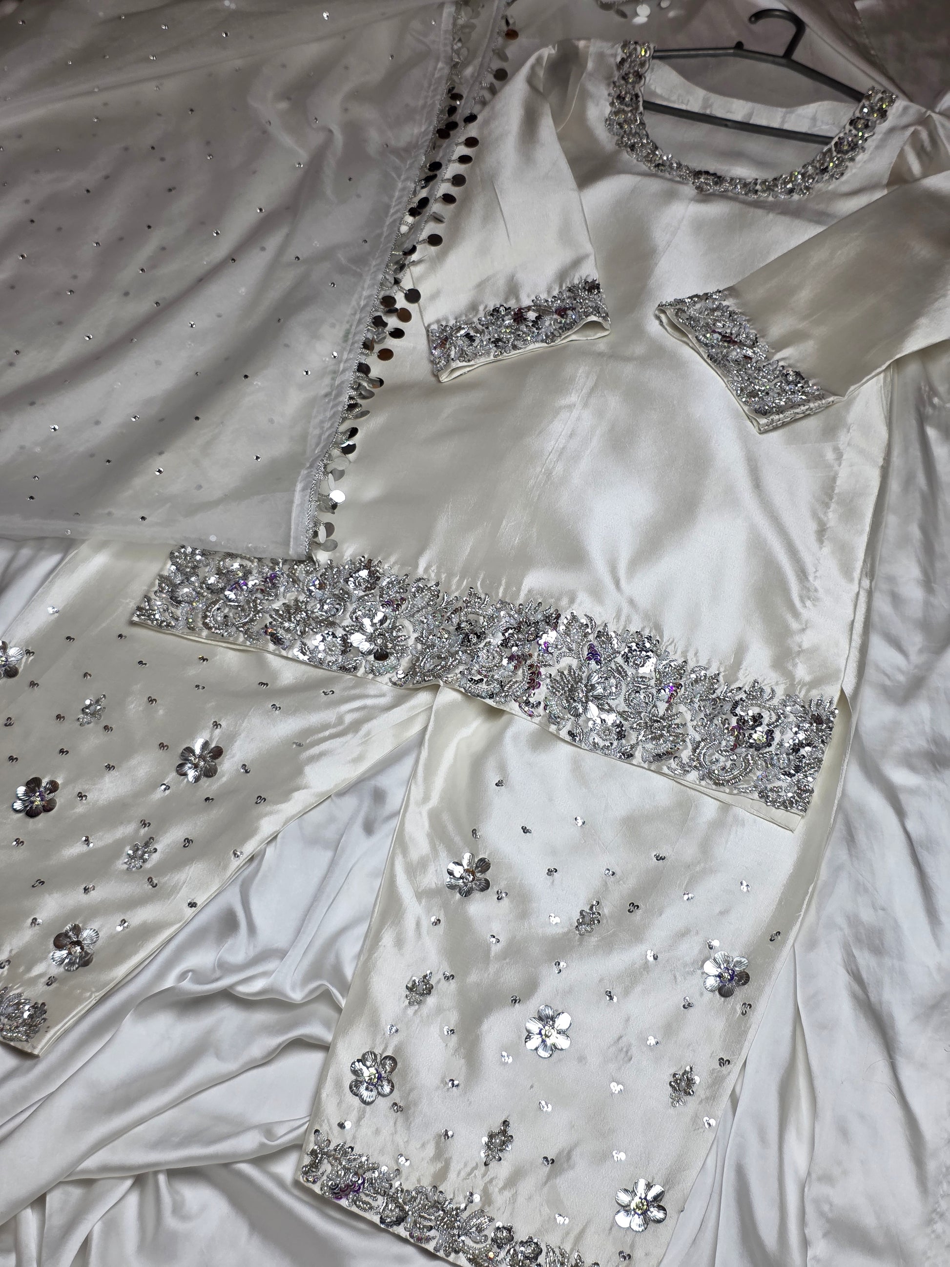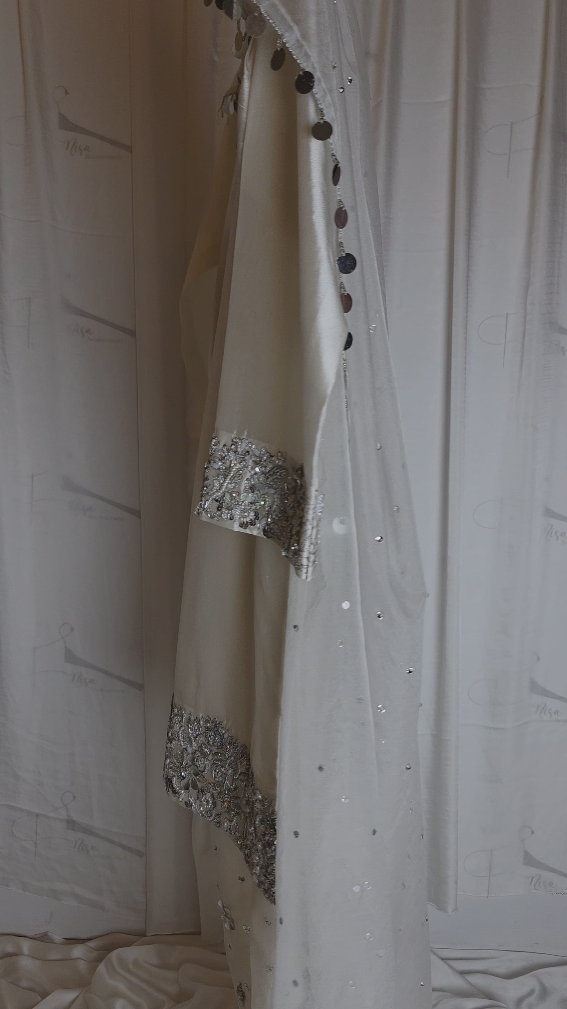 This stunning Pure Sheesha Silk Short Shirt is heavily embellished, creating a luxurious and eye-catching look. Paired with a beautifully crafted Farshi Shalwar, adorned with intricate work, and a plain organza dupatta featuring delicate lace finishing,