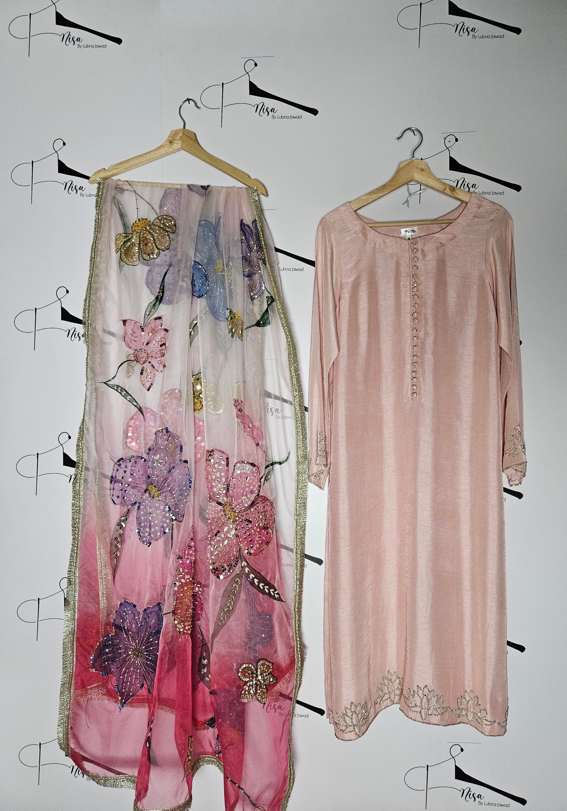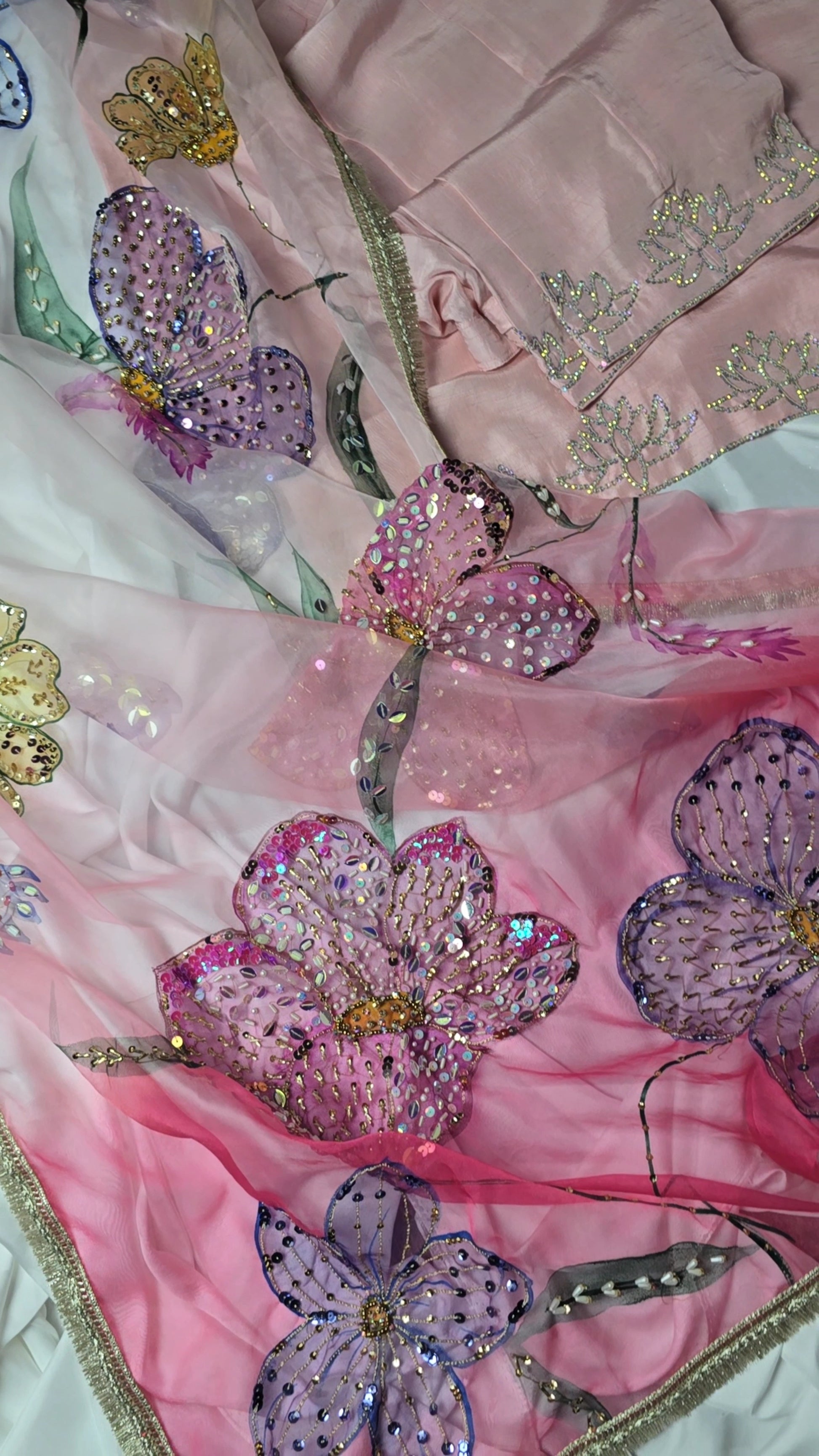 Paired with a pure organza dupatta, hand-painted and intricately hand-embellished for a truly artisanal touch.