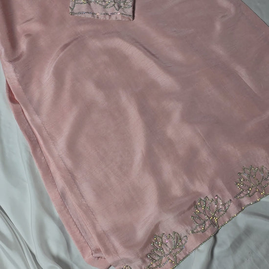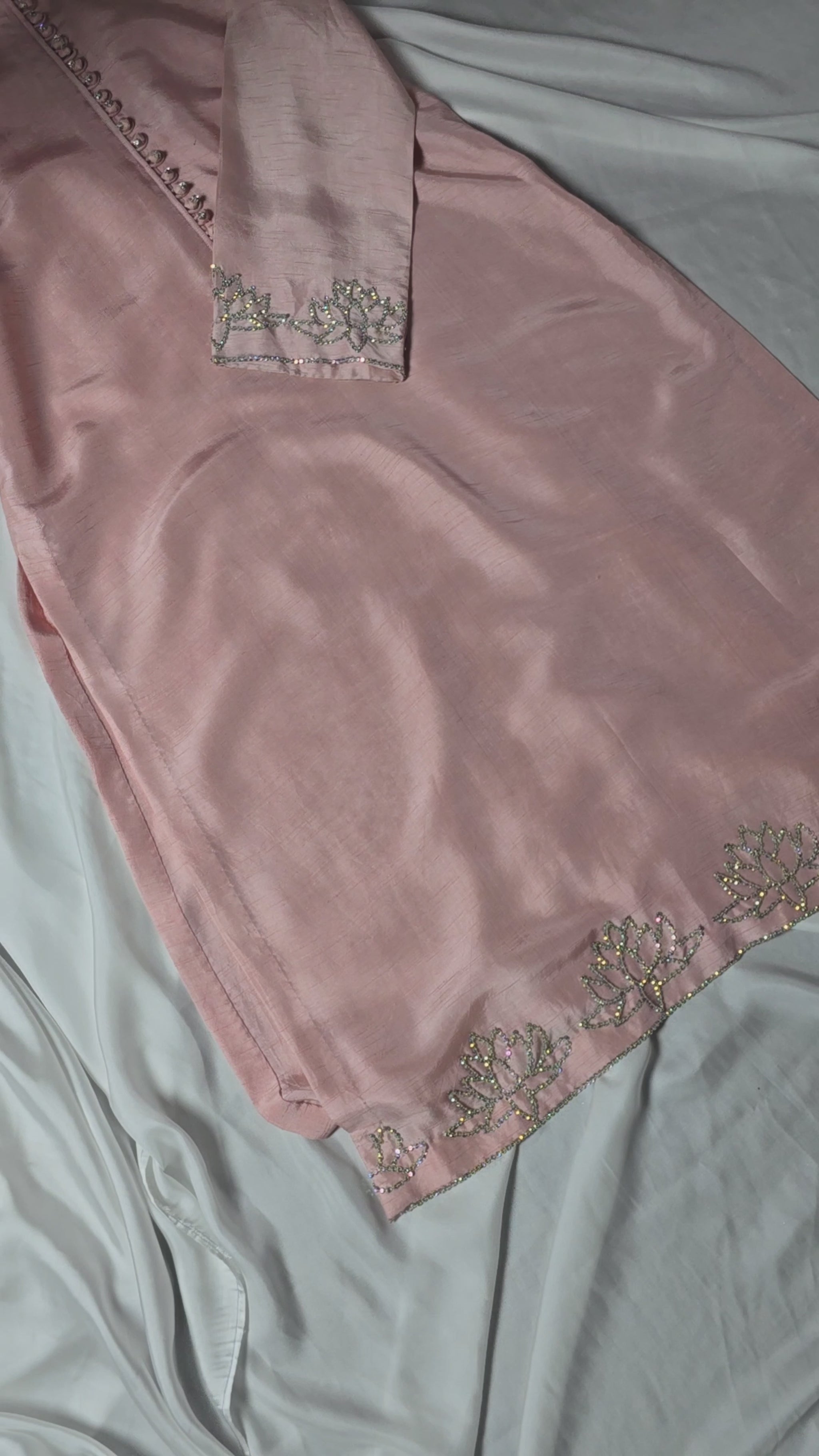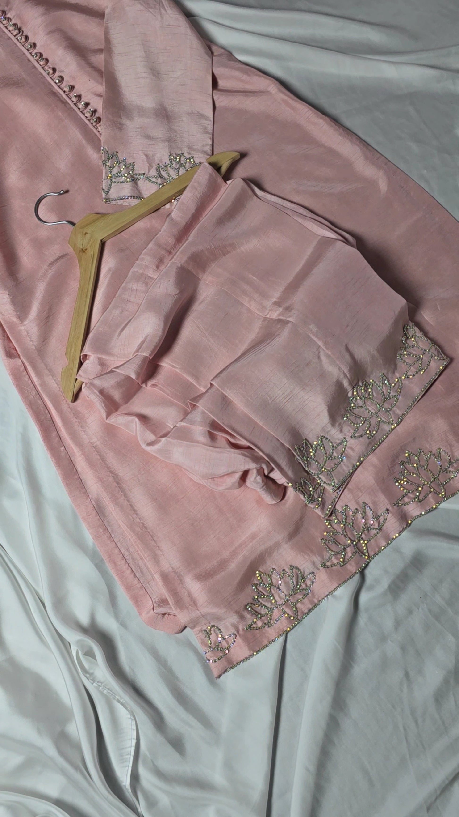 Elevate your style with this luxurious Korean raw silk suit, adorned with delicate stone work on the shirt daman, sleeves, and trouser border.